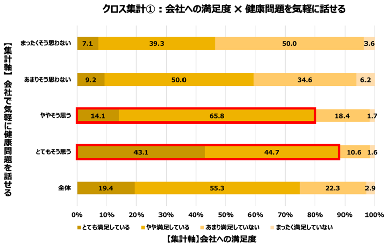 ■【クロス集計①】 「会社への満足度」と「健康問題を気軽に話せる」の2つの間には正の相関が見られる。