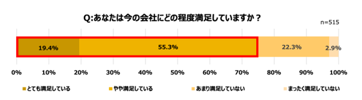 あなたは今の会社にどの程度満足していますかと尋ねたところ、約7割(74.7%)が「満足している」と回答し、会社の提供する働く環境や福利厚生、キャリアの成長機会などに対して満足していることが示唆されます。[図10]