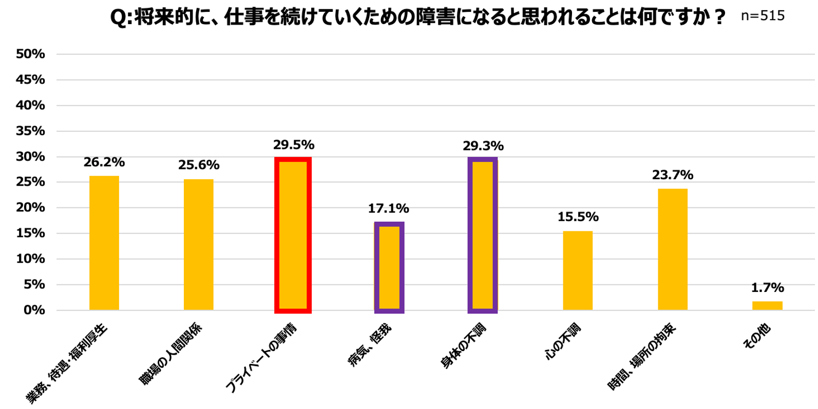 将来的に、仕事を続けていくための障害になると思われることの第1位は「プライベートの事情」(29.5%)、第2位は「身体の不調」(29.3%)、第3位は「業務、待遇・福利厚生」(26.2%)。また、現在の仕事の障害と、将来仕事の障害になると思われる数値を比較すると、最も大きな差があったのは「身体的な不調」(12.0ポイント差)。次いで、「病気や怪我」(8.7ポイント差)。