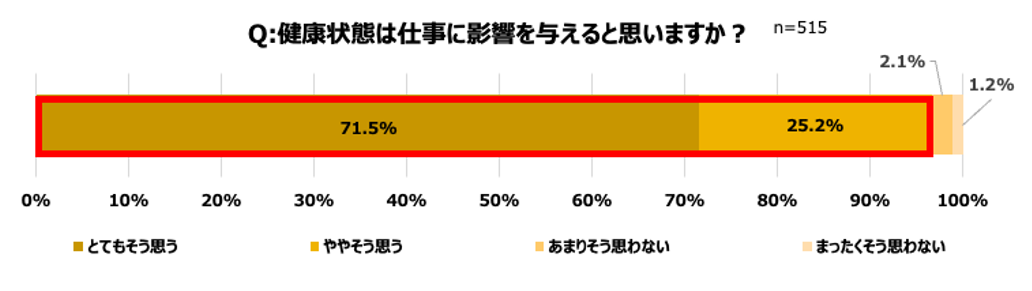 健康状態は仕事に影響を与えると思いますかと尋ねたところ、9割以上(96.7%)が「そう思う」と回答し、健康が仕事において非常に重要な要素であることが分かりました。[図4]