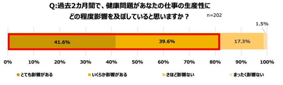 約8割が、健康問題が仕事のパフォーマンスや生産性に影響を与えていると回答。(※過去2カ月間で健康問題が理由で仕事を休んだ経験がある女性に質問)