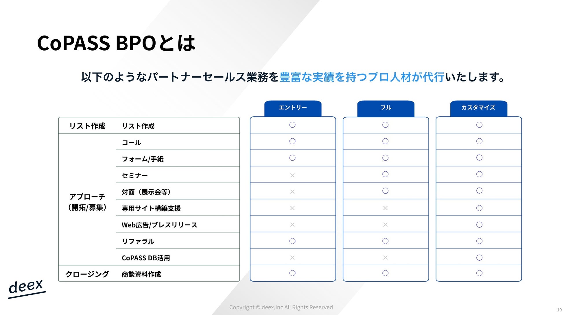 代理店ビジネスに特化したコンサルティングサービスおよびPRM(Partner Relationship Management)ツール「CoPASS」を提供するdeex株式会社(本社:東京都港区、代表取締役:牛丸順登)は、代理店(パートナー)開拓に特化したBPOサービス「CoPASS BPO」を2024年10月に正式に提供開始いたしました。本サービスは、代理店ビジネスにおける新規開拓を包括的に支援することを目的としています。