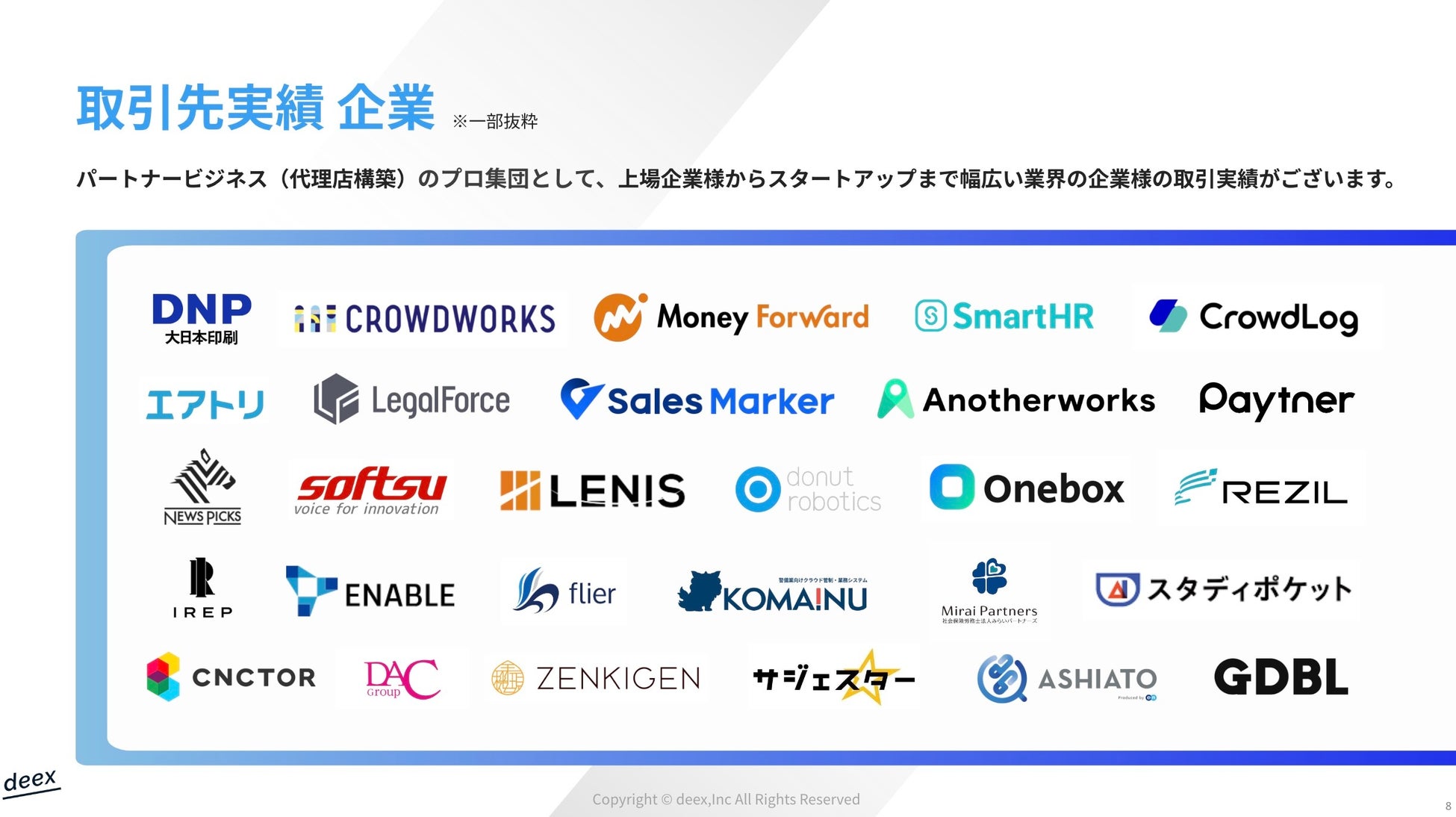 deex株式会社は、「企業が本来持っている可能性を最大化する。そのために、パートナービジネスを再定義する。」をミッションに掲げ、株式会社リクルート出身でパートナービジネスに精通したメンバーにて、代理店に関する幅広いビジネスを展開しております。 PRMという概念の基、モノやサービスを開発・販売しているメーカー(ベンダー)様が、それらを代理販売する営業代理店(パートナー)様との連携を強化・高度化するプラットフォーム「CoPASS(コーパス)」の提供や営業代理店を活用した事業成長(代理店戦略)のコンサルティング事業等を行っている会社です。