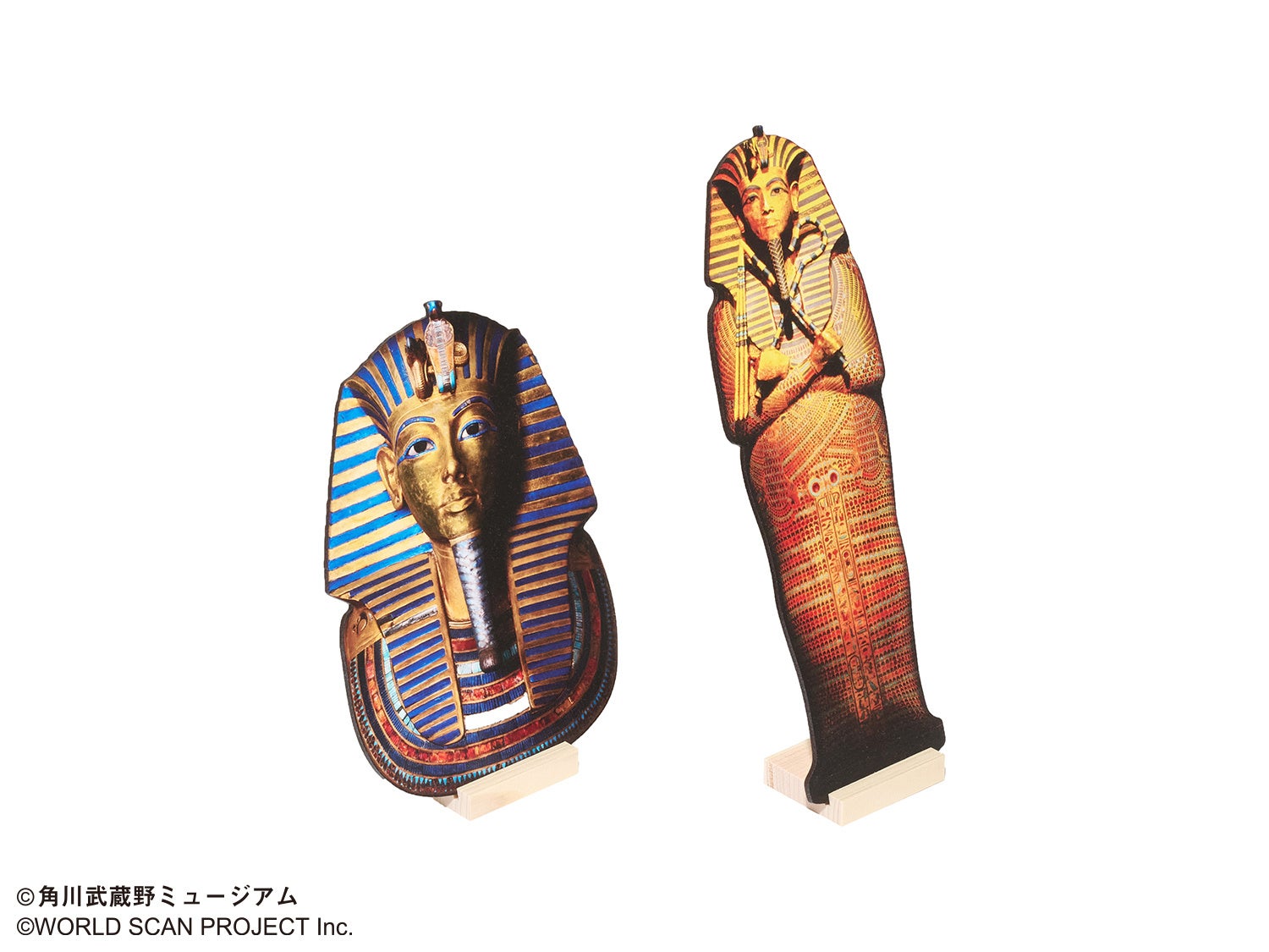 ツタンカーメンを象徴する副葬品「黄金のマスク」と「第二の人型棺」の形に沿って切り抜いた、迫力満点の木製ポストカードです。高精細印刷でまるで本物のようなリアルな陰影を再現しています。専用のポストカードスタンドと組み合わせれば、ご自宅でも鑑賞をお楽しみいただけます。