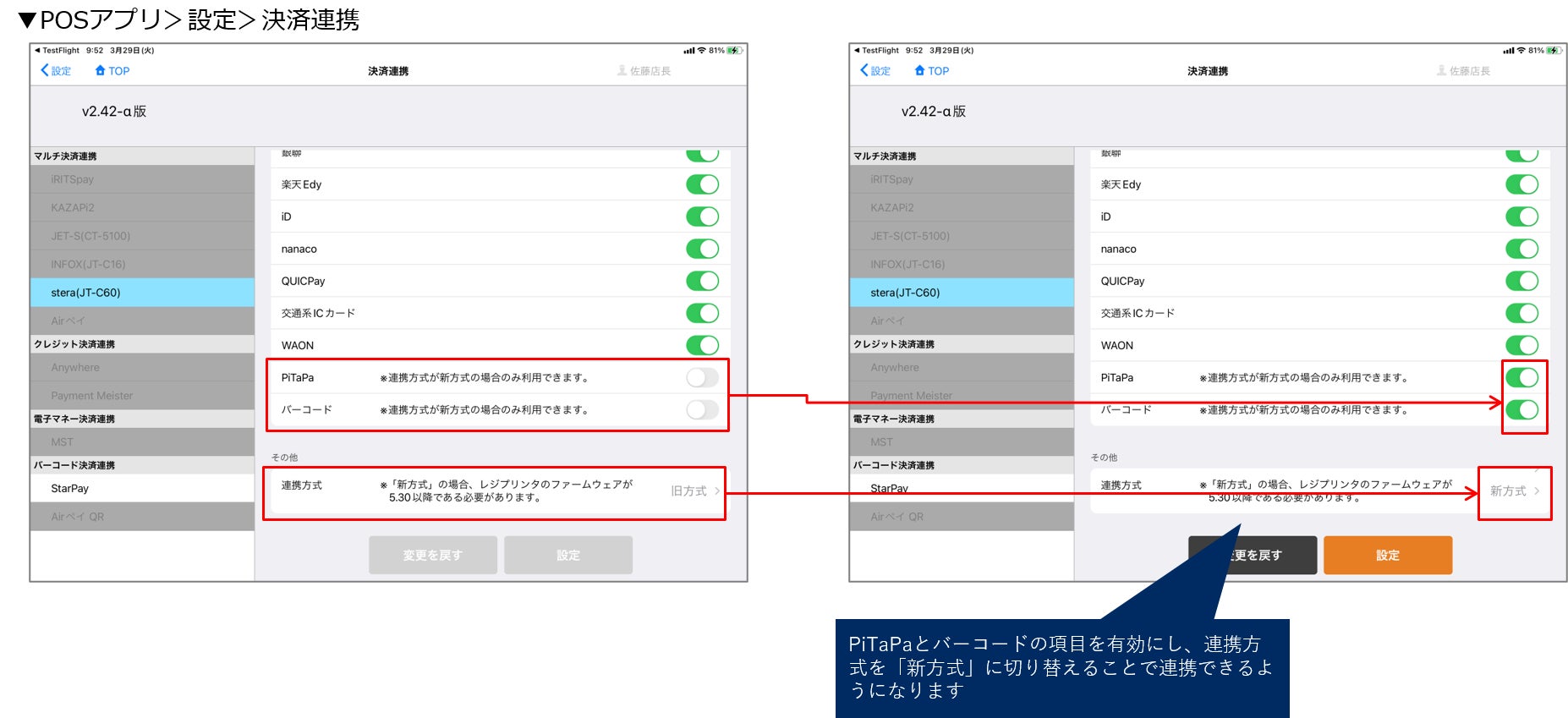 NECモバイルPOSとstera terminal(JT-C60)は、2021年1月26日にリリースしたVer2.30.0において連携可能となっていましたが、その連携範囲はクレジット決済、電子マネー決済(PiTaPa決済以外)に限られていました。今回のリリースにより、PiTaPa決済、コード決済が追加で連携できるようになりました。NECモバイルPOSアプリの設定画面より選択することで連携が可能です。