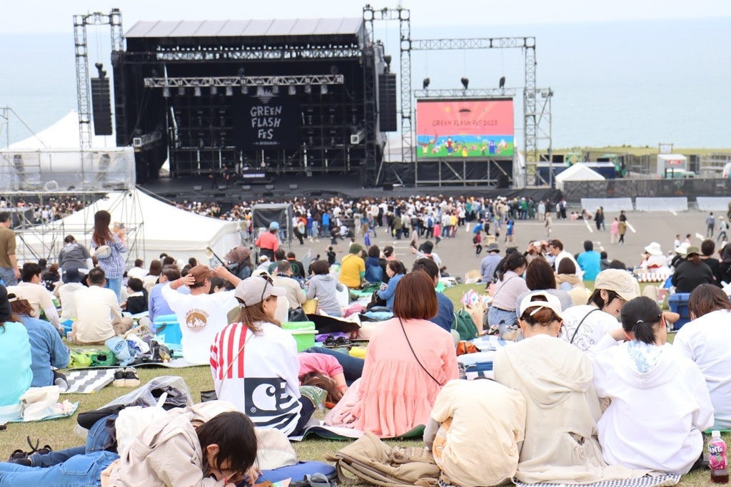目の前に広がる日本海と夕日をバックに、広大な芝生広場を会場に開催されるリゾート型フェス「グリーンフラッシュフェス」。