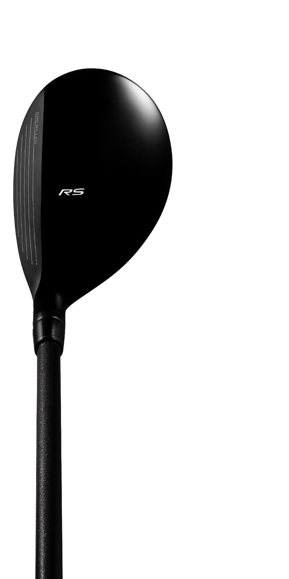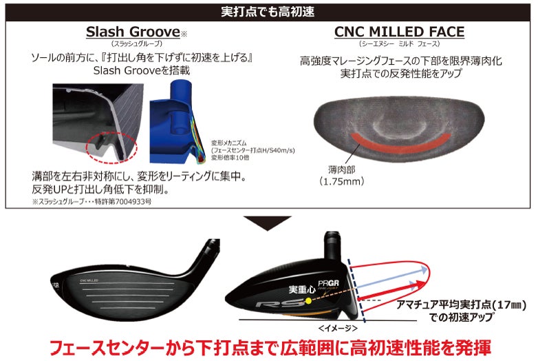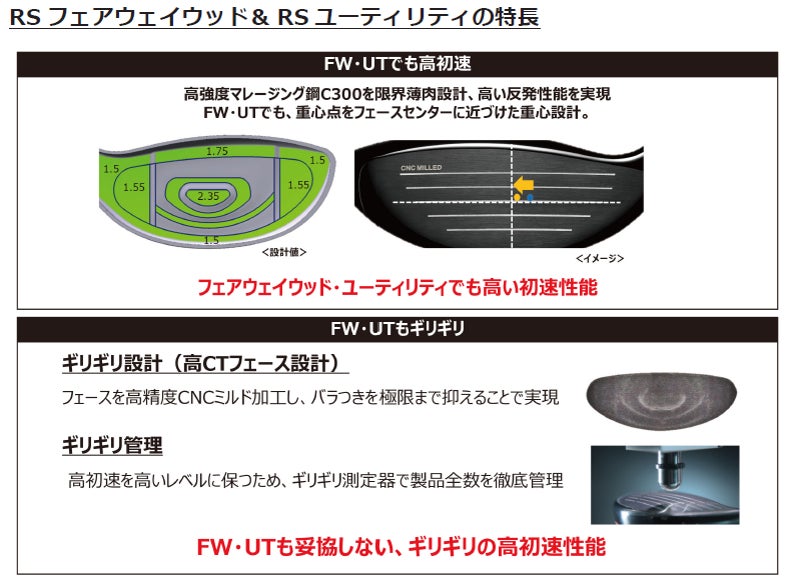 「RS フェアウェイウッド」と「RS ユーティリティ」は、いずれもフェース素材の高強度マレージング鋼 C300を限界薄肉設計することで、高い反発性能による高初速を実現しました。また、重心点をフェースセンターに近づけることでフェースセンターヒット時の初速性能を高めるとともに、フェースセンターより下のアマチュア平均実打点でも高い初速を得られるよう、「Slash Groove(スラッシュ・グルーブ)」や「CNC MILLED FACE(シーエヌシー・ミルド・フェース)」を採用し、広い高初速エリアを獲得しています。さらに、「RS フェアウェイウッド」は低スピン、強弾道で飛距離最大化を図るため、クラウンに低比重のCFRPを採用し低・浅重心設計としました。同様に、「RS ユーティリティ」も低スピンと強弾道による優れた飛距離性能と高い操作性を両立するため、やや小ぶりなヘッドで低・ 浅重心設計としました。このほか、フェアウェイウッドは下番手で適度なスピンが入るよう、ユーティリティは適正な番手間の飛距離差になるよう、番手別に高精度な設計を施しています。