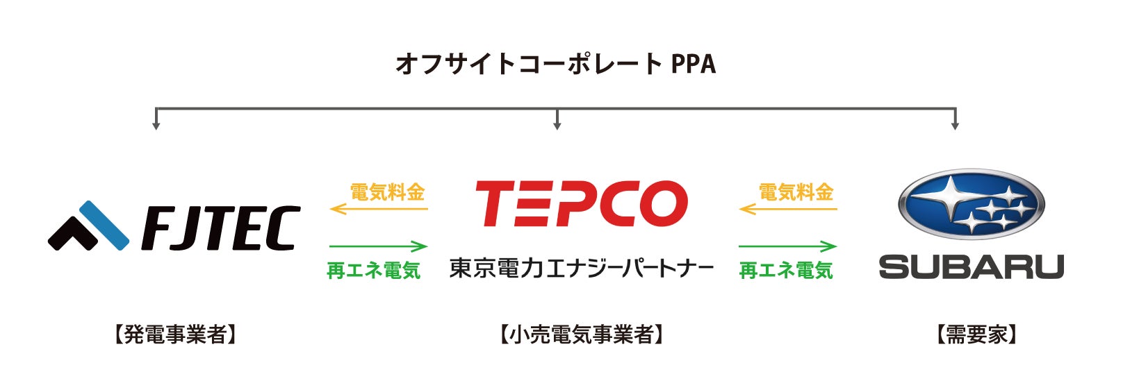 本事業では、発電事業者である富士テクが保有する太陽光発電所で発電した再エネ100%由来の電気を小売電気事業者である東京電力EPを通じて最終的な需要家であるSUBARUに対して20年間供給します。