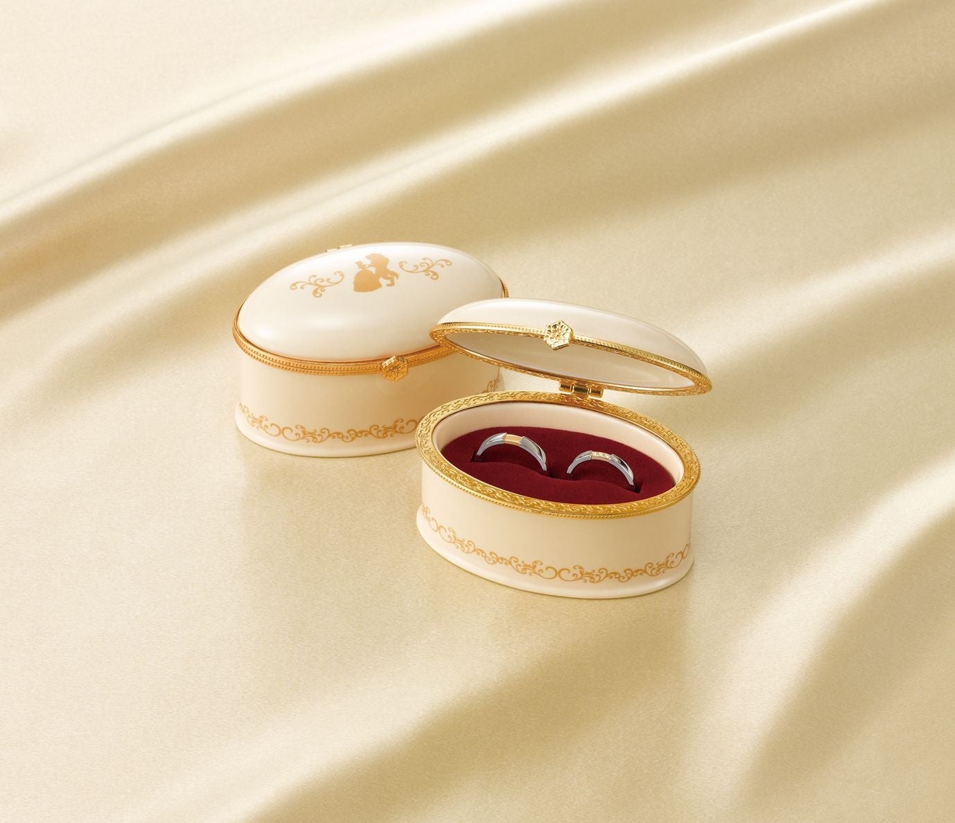 マリッジリング(結婚指輪)は“ダンスで近づく二人の気持ち”を、プラチナを繋ぐゴールドのラインで表現。ベルと野獣の思いが繋がる美しく印象的なシーンをイメージしたロマンティックなデザインです。