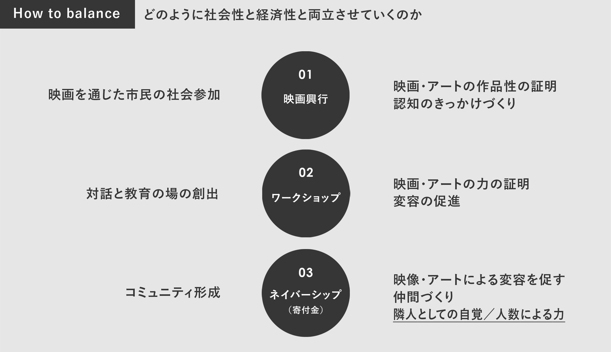 普段一人で観ることの多い“映画”ですが、コミュニティで一緒に観ることで、自分にも他者にも気づきを与え合い、個人とコミュニティで新しい選択肢に気づいていく。そんな活動になればという想いから、「Art with Neighbors」というコンセプトが生まれました。社会性と経済性を両立する、新しい映像レーベルを実現していきたいと思っています。