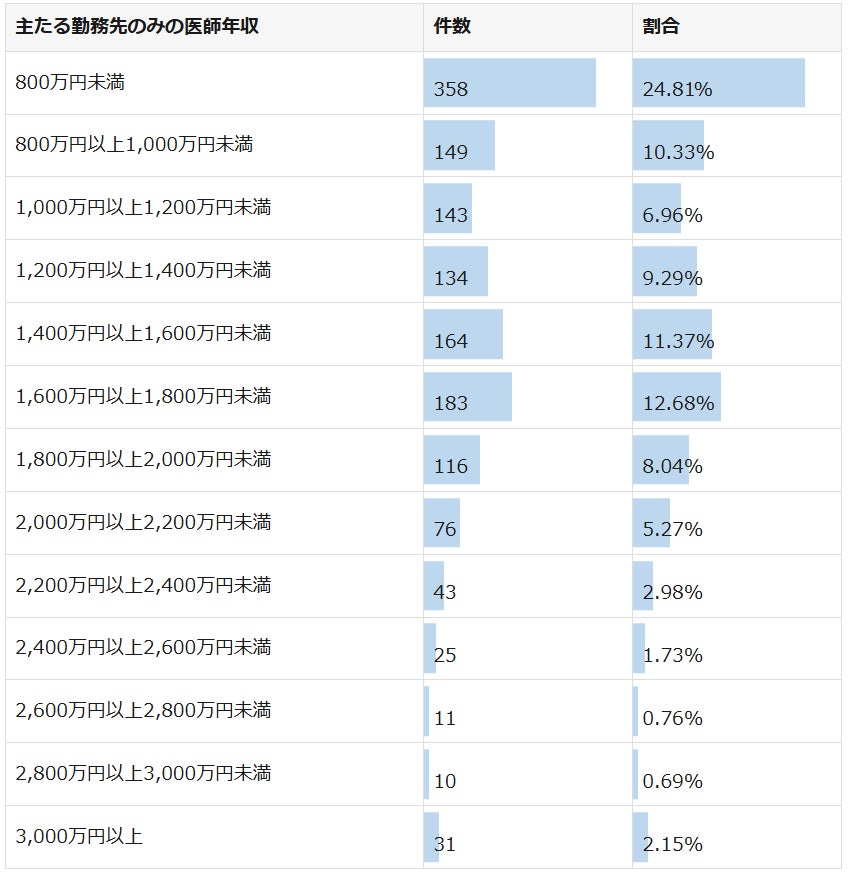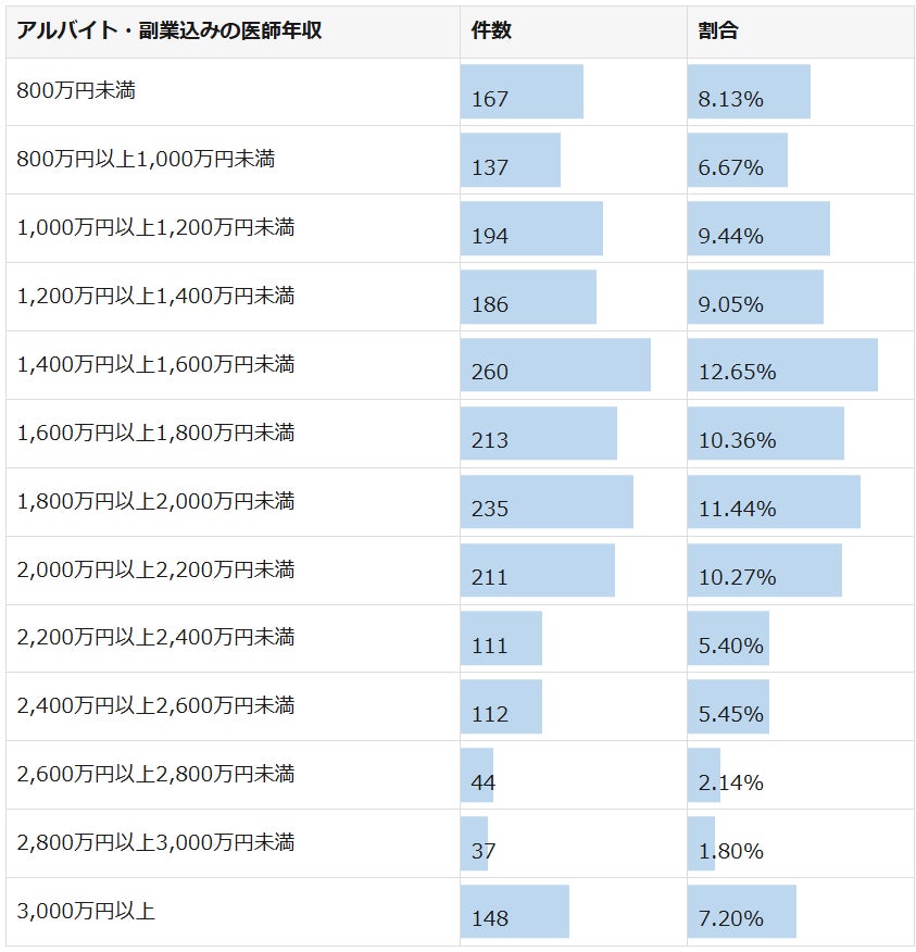 医師のアルバイト・副業込みの年収では1,400~1,600万円が最も多くなっており、年収の中央値は1,700万円となっていました。