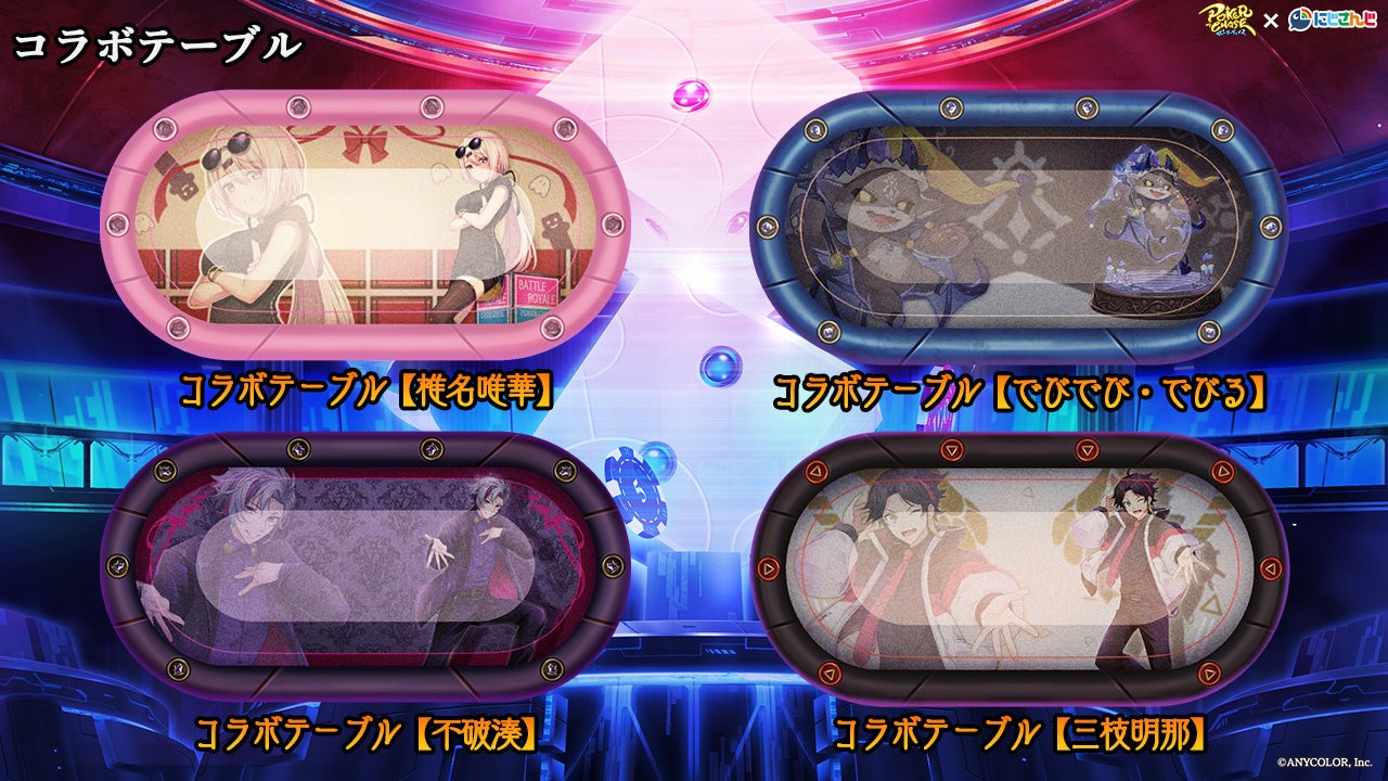 人気バーチャルライバーグループ「にじさんじ」所属の人気ライバーである「三枝明那」さん、「不破湊」さん、「でびでび・でびる」さん、「椎名唯華」さんの4名が『ポーカーチェイス』内のプレイアブルキャラとして期間限定で実装されます。