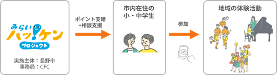 同モデル事業は、長野市内在住の小中学生全員(約28,000人を想定)に対し、スポーツや文化芸術活動、自然体験等の多様なプログラム参加に利用できる電子ポイントを付与し、子どもたちが体験の機会を得られるようにするとともに、長野市内で活動する事業者や団体等と連携しながら、子どもの体験を地域で支える仕組みを構築することを目指す取り組みです。