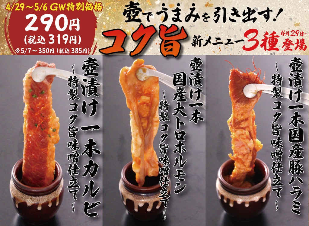 4/29~壺漬け新メニュー3品が登場!また4/29~5/6GW期間中、GW特別価格290円(税込319円)でご提供いたします。※5/7~ 350円(税込385円)