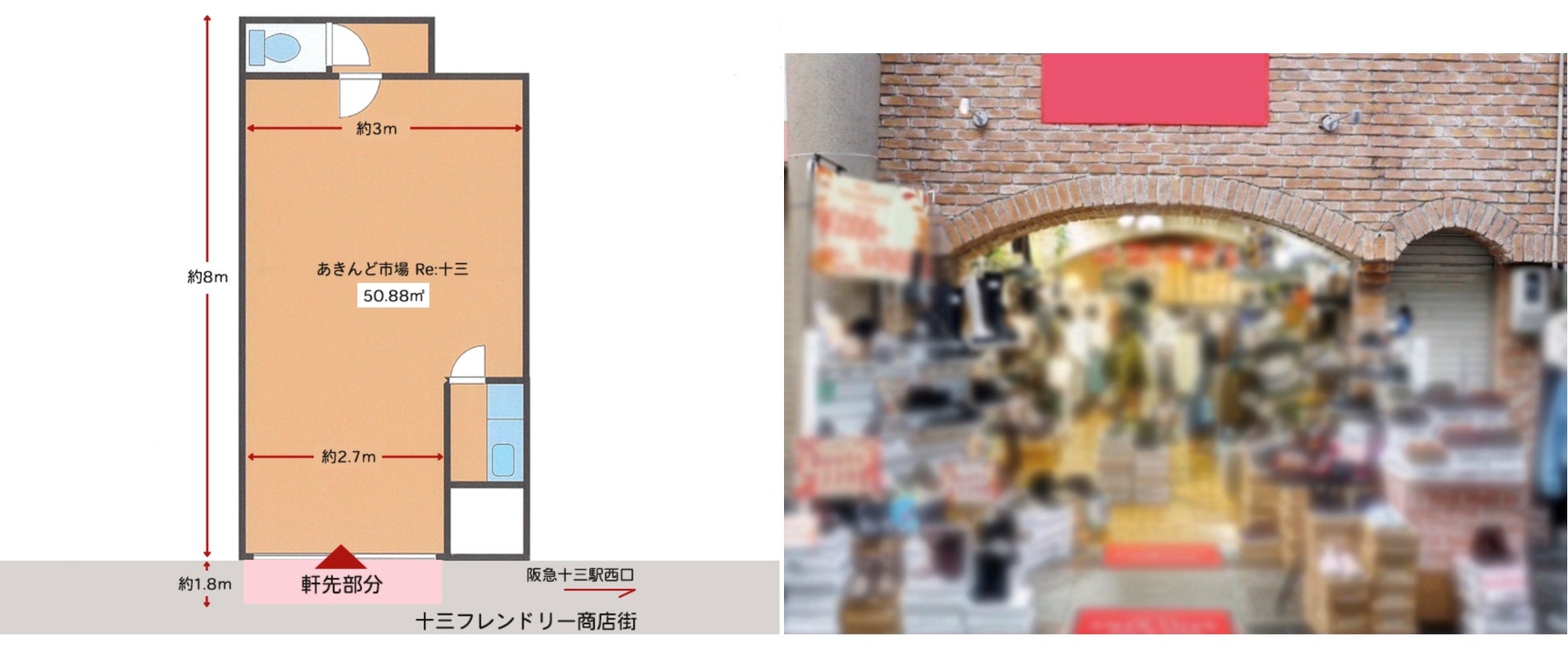 十三フレンドリー商店街入ってすぐの路面店で店舗1F部分50.88㎡+軒先部分を1日単位からご利用いただけます。