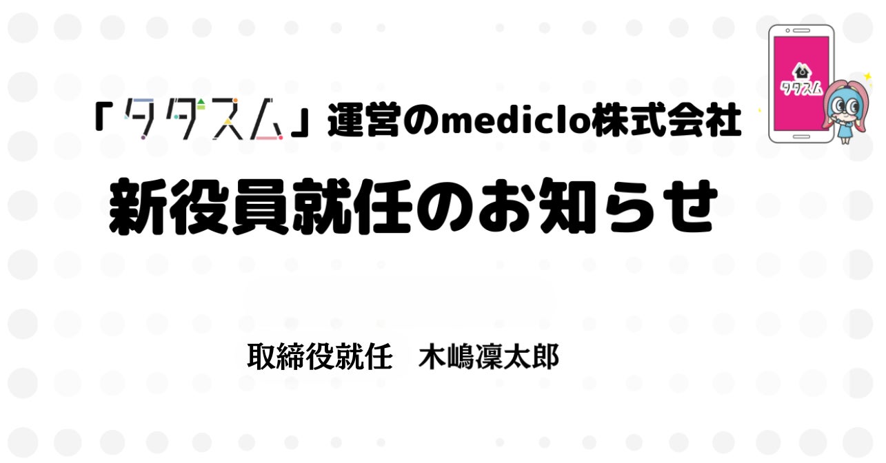 「タダスム」を運営するmediclo株式会社の新役員に、木嶋凜太郎氏が就任