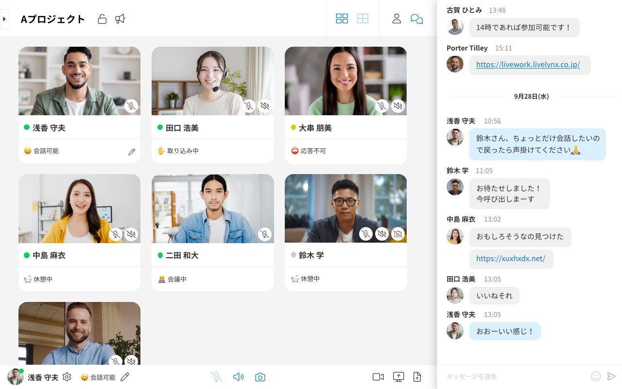 「LIVEWORK」は「リモートワークにオフィスの臨場感とチームの一体感を。」をコンセプトに、チームコラボレーションを促進するバーチャルオフィスツールです。「LIVEWORK」独自の「ワーカービュー機能」や「仮想ルーム機能」が、オフィスの自席から見えるいつもの光景・顔ぶれをオンライン上で再現します。また、「インスタントトーク機能」「プレゼンス機能」「ステータス機能」「画面共有機能」「パーソナルタグ機能」「外部ツール連携機能」によって、オフィスでのリアルなコミュニケーションに引けを取らない、シンプルかつスピード感のあるコミュニケーションが可能となり、チームコラボレーションが加速します。