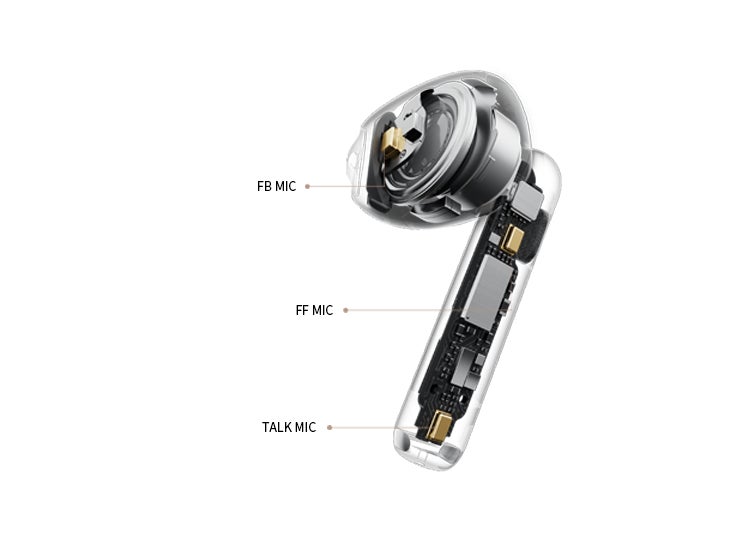 左右イヤホンに各3基/計6基搭載の高性能小型マイクを搭載、うち2基はフィードフォワード/フィードバック方式を併用するハイブリッド型アクティブノイズキャンセリングに利用しています。 もう1基は環境ノイズと人の声を正確に分離し、環境ノイズだけをインテリジェントに除去する「AI通話ノイズキャンセリング」に活用することで、騒がしい場所でもクリアな音声通話を実現します。