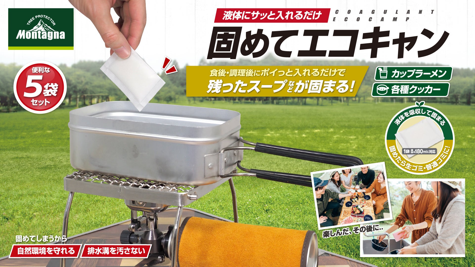 特徴:カップラーメンやお鍋の残り汁を、固めて捨てられるエコアイテム。残ったスープに入れるだけでそぼろ状に固まり、生ゴミまたは普通ゴミとして捨てられます。環境を汚さずに自然に優しいエコキャンプを楽しもう!