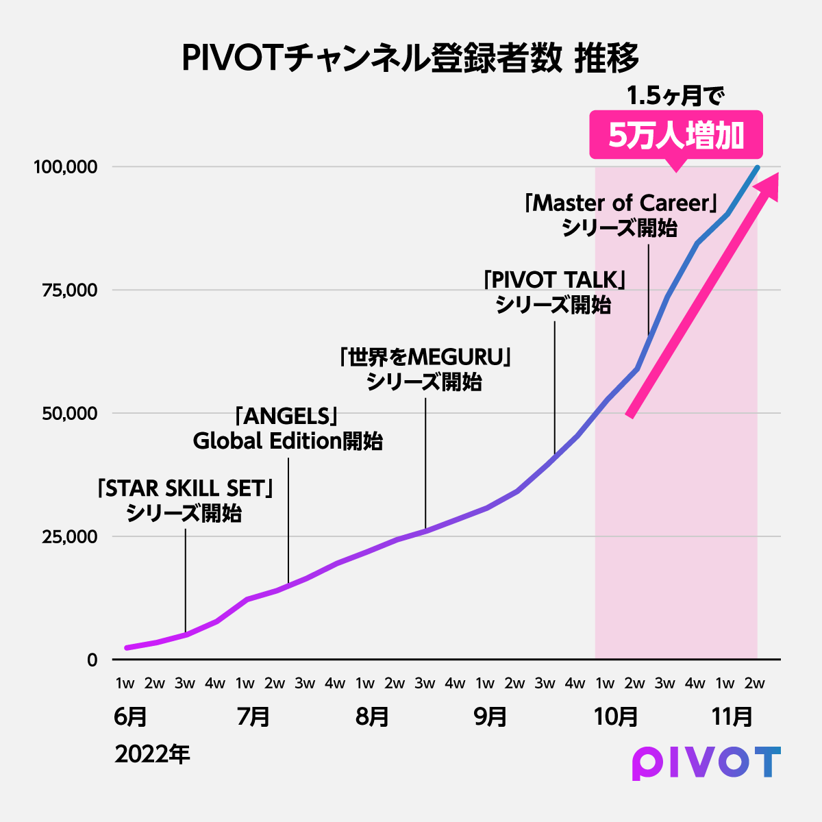 また、元テレビ朝日アナウンサーで現在はスタートアップで広報となった大木優紀氏が、広報のプロにPRの技術を学ぶ「Star Skill Set」のほか、大企業からのキャリアの転換の手法を伝える「Pivotter」や、注目のビジネスパーソンの履歴書をたどりながらキャリアを築くコツを学ぶ「Master of Career」なども順調に視聴者を増やし、10月の第1週に登録者5万人を突破。その後1ヶ月半で、それまでのペースのおよそ2倍以上のスピードで、登録者がさらに5万人増加し、10万人達成へと至りました。