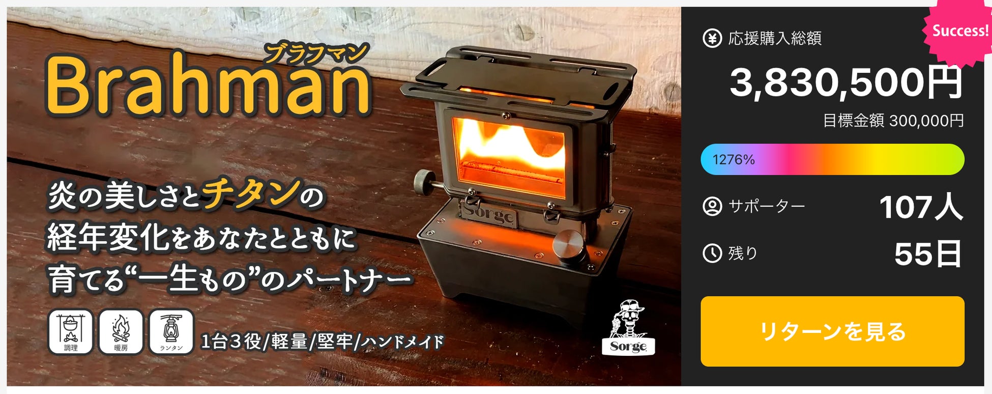 株式会社いちばんぼし(代表取締役:浅山佳映子、東京都)は、アウトドアブランド「Sorge(ゾルゲ)」より、純チタン製の多機能アイロンストーブ「Brahman(ブラフマン)」を応援購入サービスMakuakeにて先行販売開始しました。
