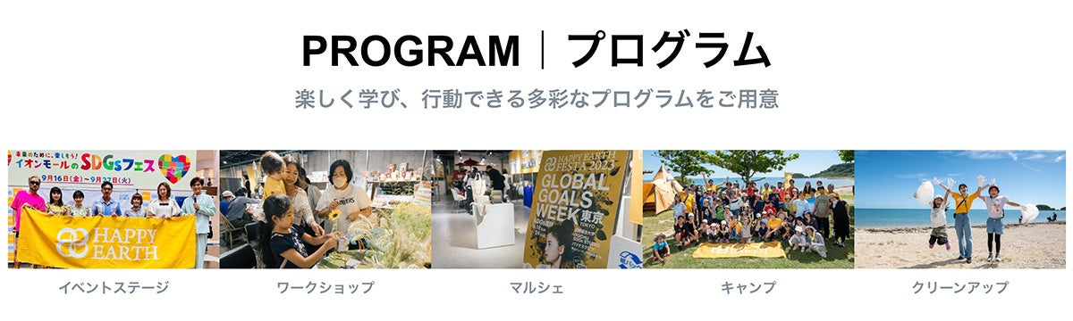 『HAPPY EARTH FESTA 2024』では、人と地球の幸せな未来について考えるトークショー、楽しくSDGsに貢献できるワークショップ、エシカルやウェルネスをテーマにしたマルシェ、自然の中で楽しみながらサステナビリティを学び、生きる力も育むキャンプ、街やビーチのクリーンアップ活動など多彩なプログラムを展開します。