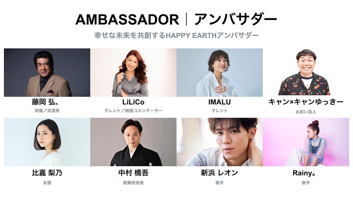HAPPY EARTHアンバサダーには、藤岡弘、氏・LiLiCo氏・IMALU氏・キャン×キャンゆっきー氏・比嘉梨乃氏・中村橋吾氏・新浜レオン氏・ Rainy。氏の8名にご就任いただきました。東京・大阪・沖縄の各会場でステージへのご登壇や情報発信をしていただきます。