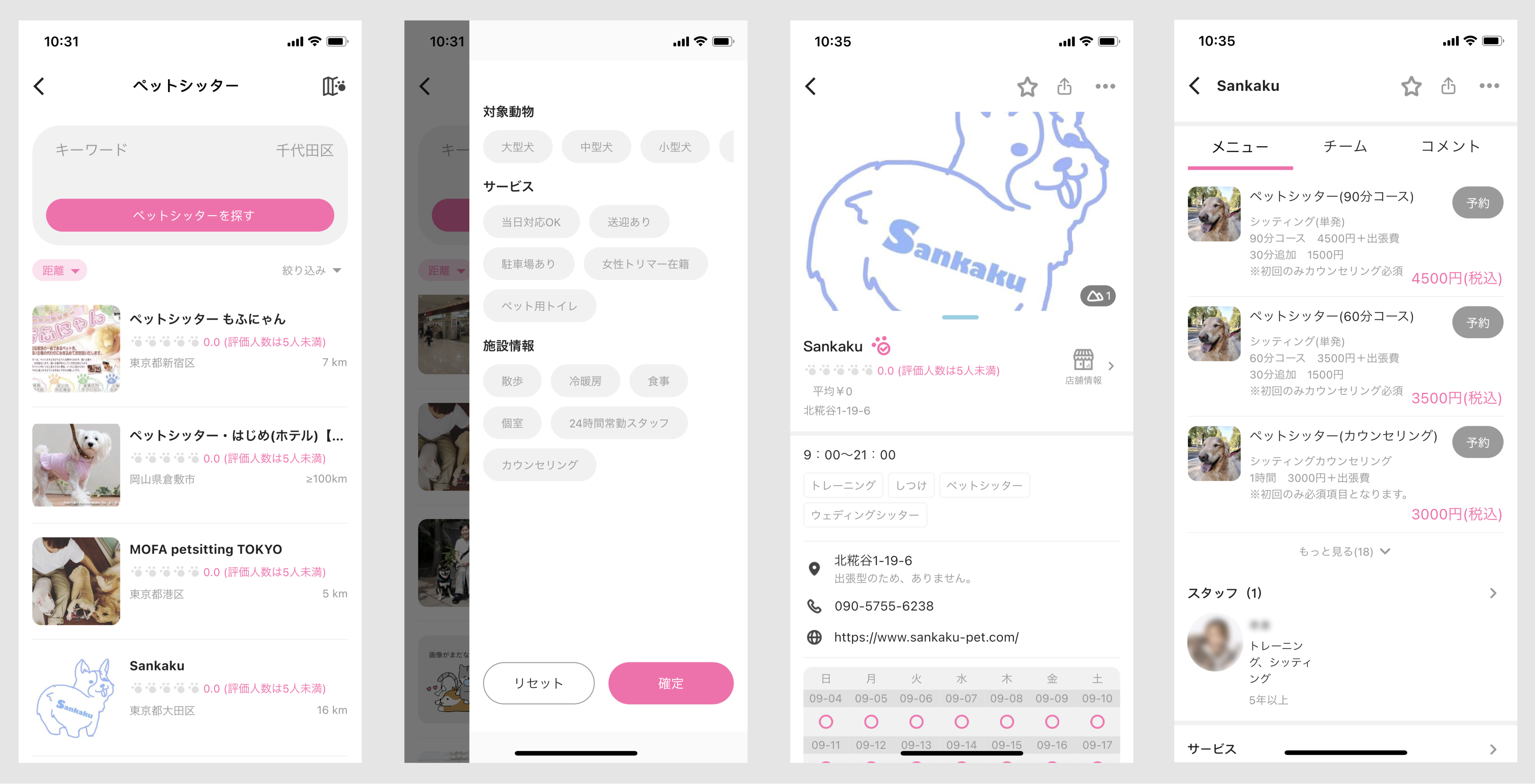 新たに公開されたペットのシッター探し機能は、『Pet』内に新設された「シッター」チャンネルから利用できます。シッターが必要な対象動物の種類やシッター提供者に関する条件で検索すると、該当するシッターサービス提供者の一覧が表示されます。