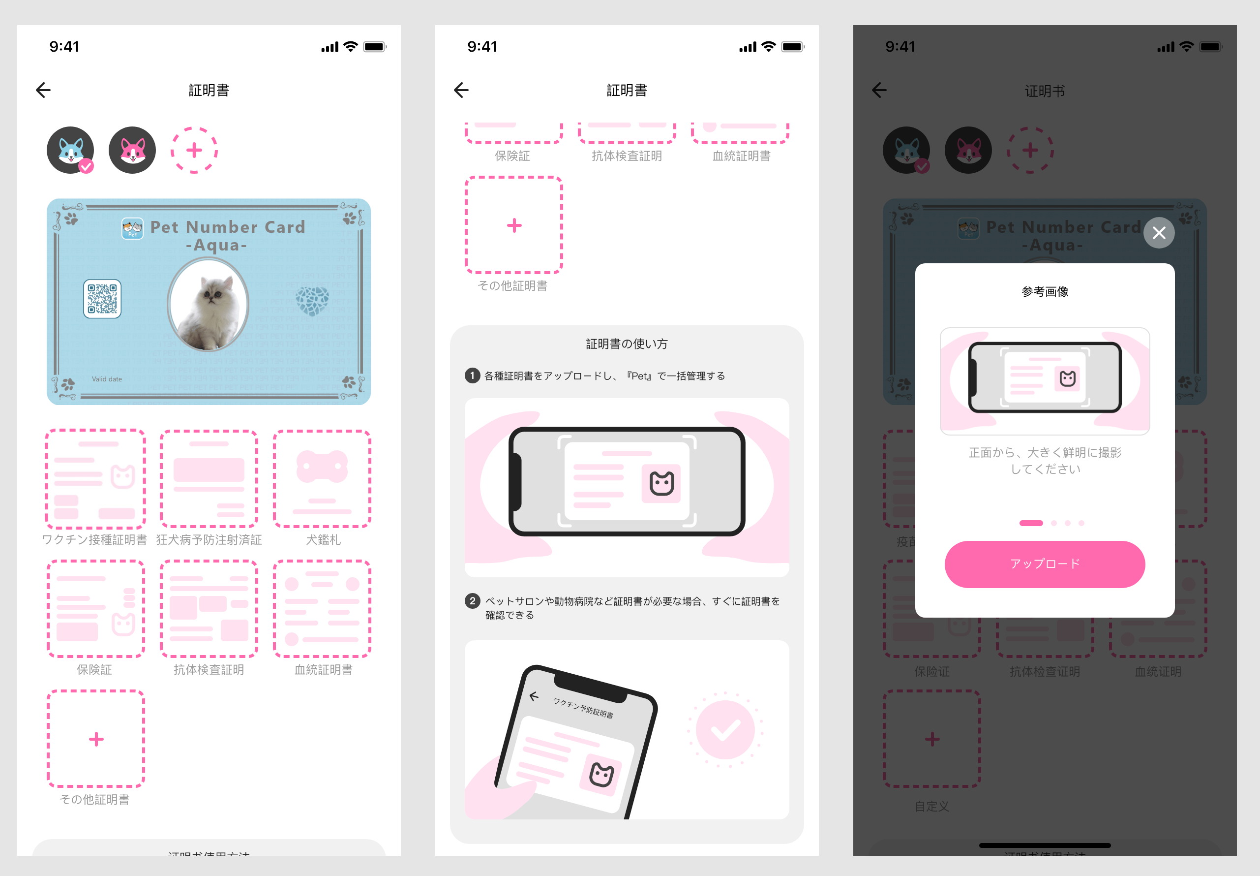 「シッター」以外、ペット用の各種証明書のアップロードと管理ができる「証明書」チャンネルも公開されました。こちらでは、ペットのワクチン接種証明書、狂犬病予防注射済症、鑑札、保険証、抗体検査証明および血統証明書を写真でアップロードでき、ペットサロンや動物病院などにおいて、証明書が必要になった際に『Pet』からすぐ確認できるようになっています。