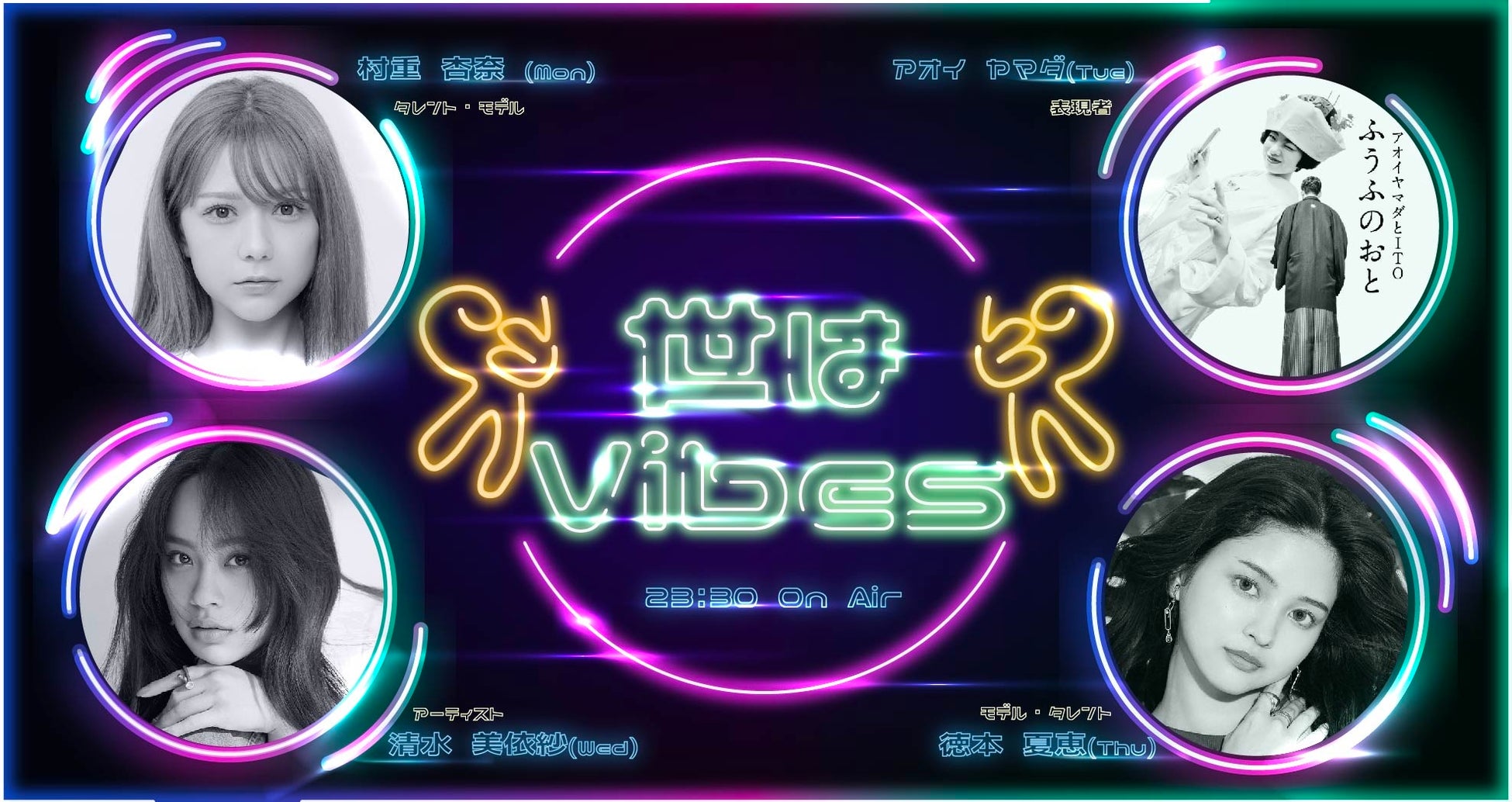 ”ソウルフルな思考”をもつパーソナリティが、ピュアかつ熱を帯びた言葉を紡ぐソウルフルなPodcast番組「世はVibes」。パーソナリティは、元HKT48メンバーで、現在フジテレビ系バラエティー番組『呼び出し先生タナカ』に出演中、明るく独特なポジティブキャラでバラエティーやコメンテーターとして活躍する「村重杏奈」、メディアアート集団ダムタイプ「2020」等に出演、東京オリンピック2020閉会式にソロ出演、その他数々の作品で役者出演を果たす今注目の表現者「アオイヤマダ」、ディズニーのグローバルな祭典「アルティメット・プリンセス・セレブレーション」の日本版テーマソング「Starting Now~新しい私へ」の歌唱アーティストであり、2022年4月メジャーデビューシングル「High Five」をリリース、天性の歌声に注目が集まる「清水美依紗」、大阪府出身で2016年5月に雑誌「Popteen」にてモデルデビュー、2017年AbemaTVの大人気恋愛リアリティーショー「オオカミくんには騙されない♡」への出演で注目を集め、現在登録者数15万人を超えるYoutubeチャンネル【なちょすのへや】にて自信のライフスタイルやトレンドを発信する「徳本夏恵」が登場する。