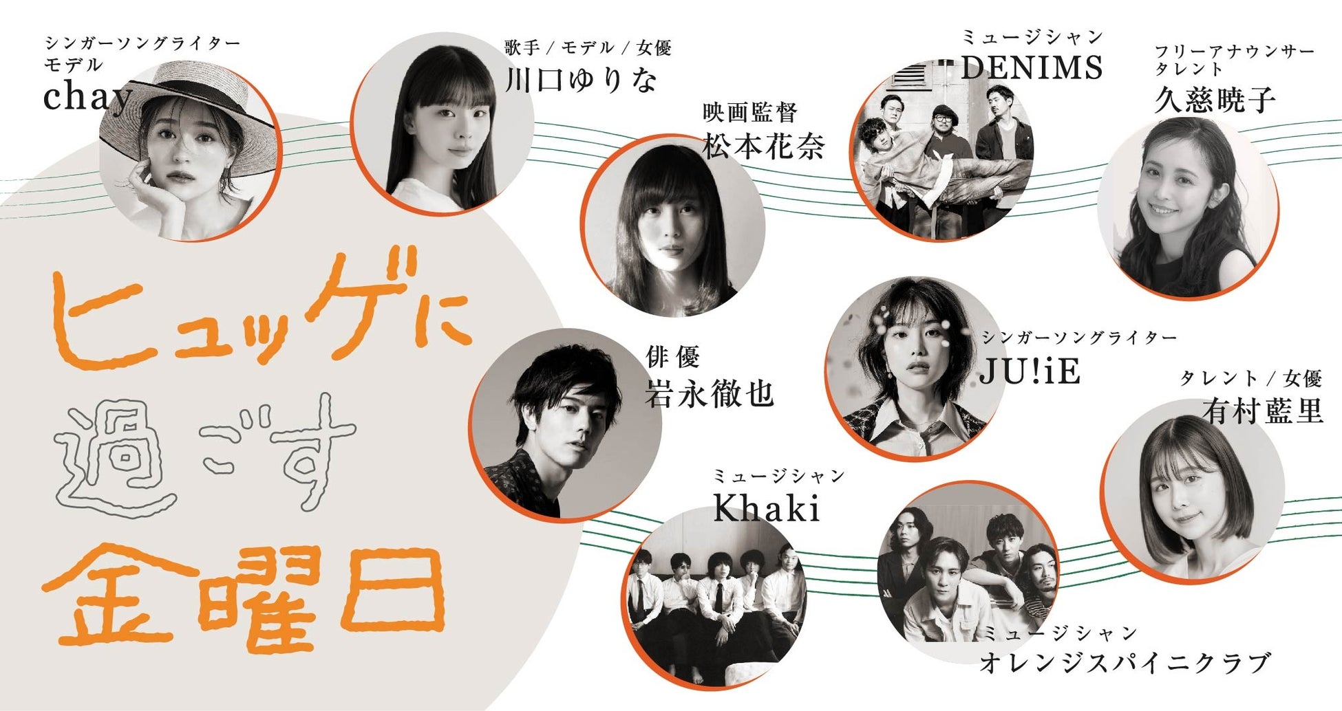 また、バンドシーンからは、人間味溢れる歌詞や甘酸っぱいメロディを武器にエモーショナルなライブで観客を沸かせ国内外の大型フェスにも出演する「DENIMS」、東京を拠点に活動する大注目の若手5人組、イマーシブ・アートロックバンド「Khaki」、『キンモクセイ』がSNSを中心に話題となり、音楽配信サービスの総再生回数は1.5億回をこえる「オレンジスパイニクラブ」が名を連ねる。