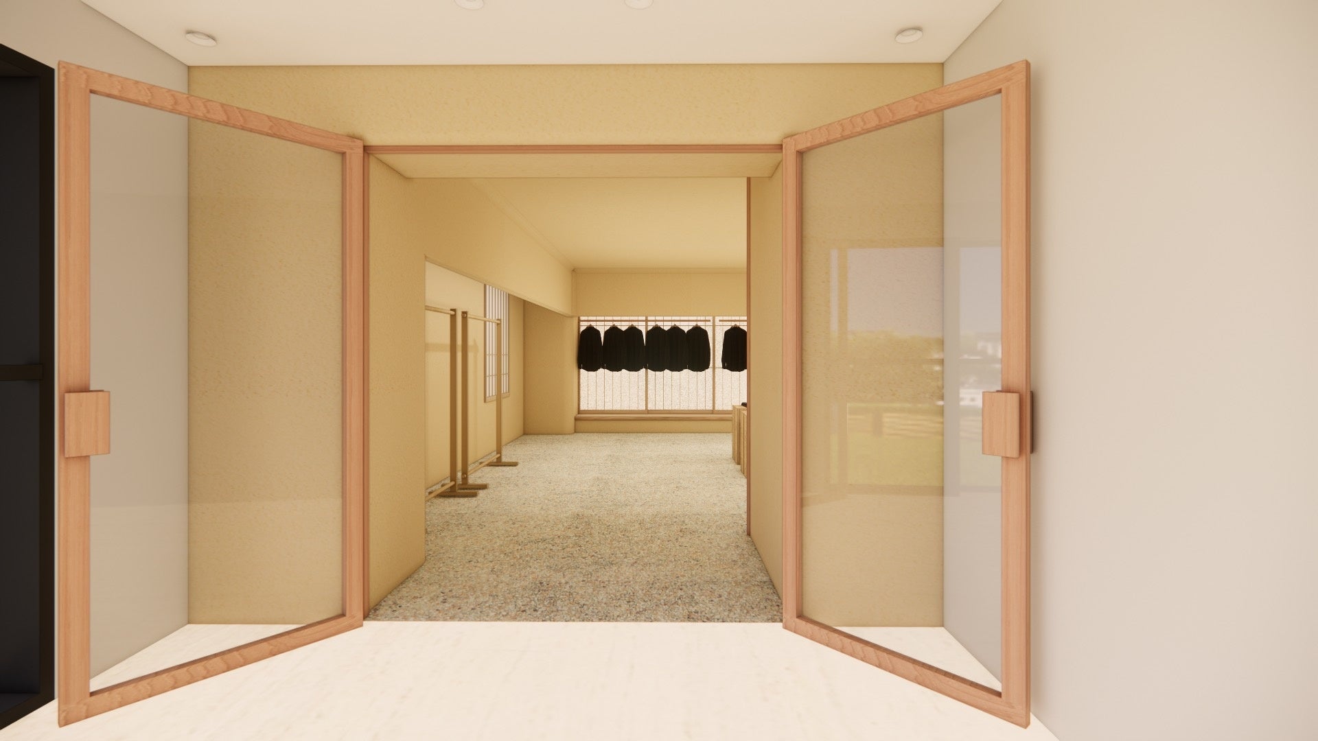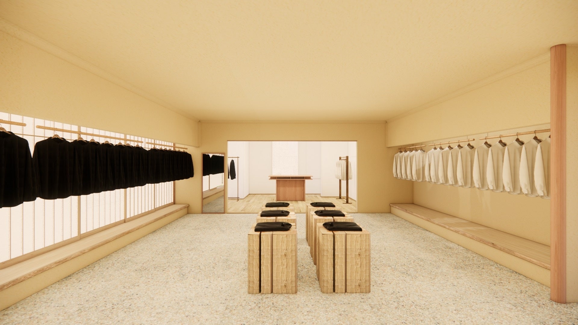 国内初となる旗艦店の内装デザインは、小大建築設計事務所・小嶋伸也氏によって手掛けられており、聚楽壁、和紙、障子という日本で古くから馴染みのある伝統素材のみを使い、それらの素材にeunoiaの特徴でもある曲面処理などのさり気ないディテールを入れることで、従来の荒い土壁とは異なる滑らかに柔らかい雰囲気の土壁を表現しています。eunoiaの「精選された素材を技能により多彩な表現へと創造する」という精神を店内にも落とし込み、設計されました。