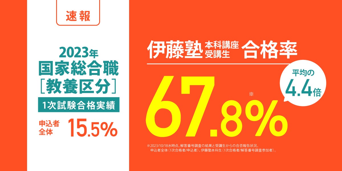 人事院は2023年10月18日(水)9:00に、令和5年(2023年)国家総合職[教養区分]1次試験の合格発表を行った。それを受け、法律資格専門の受験指導校『伊藤塾』(塾長 伊藤真)を運営する株式会社法学館(所在地:東京都渋谷区)は、本科講座受講生の合格実績の速報と喜びの声を公開した。