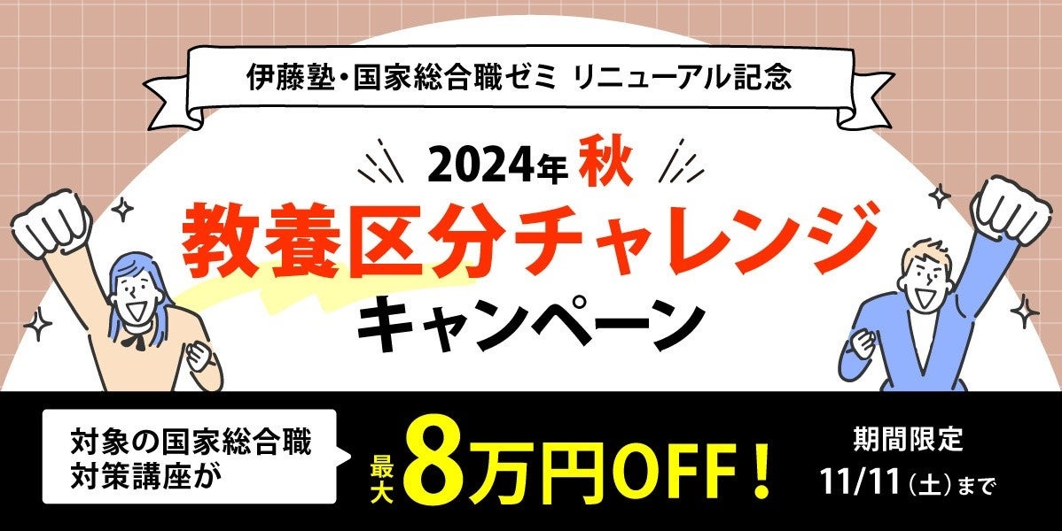 出願者増加にともない合格水準が上がると見込まれる教養区分試験。伊藤塾ではこの傾向に対応するため、定評ある『国家総合職ゼミ』をリニューアルします。今回のリニューアルを記念して、2024年合格を目指す学生を費用面でも応援するキャンペーンを期間限定で行っています。