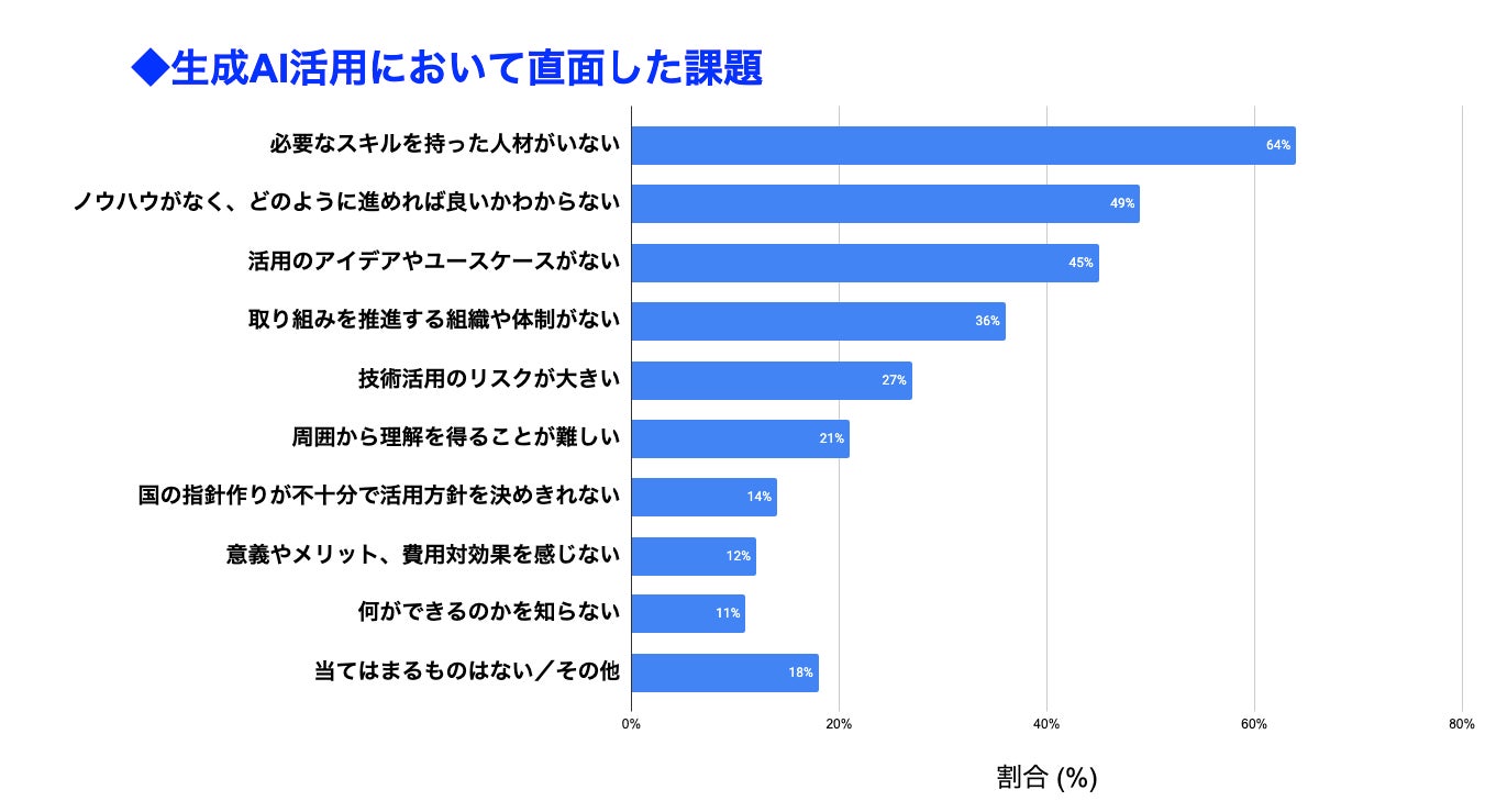 生成AI活用において日本企業が直面している課題の上位は、ノウハウや人材関連のものとなっており、各企業におけるAIに詳しい人材育成の必要性が高い状況です。