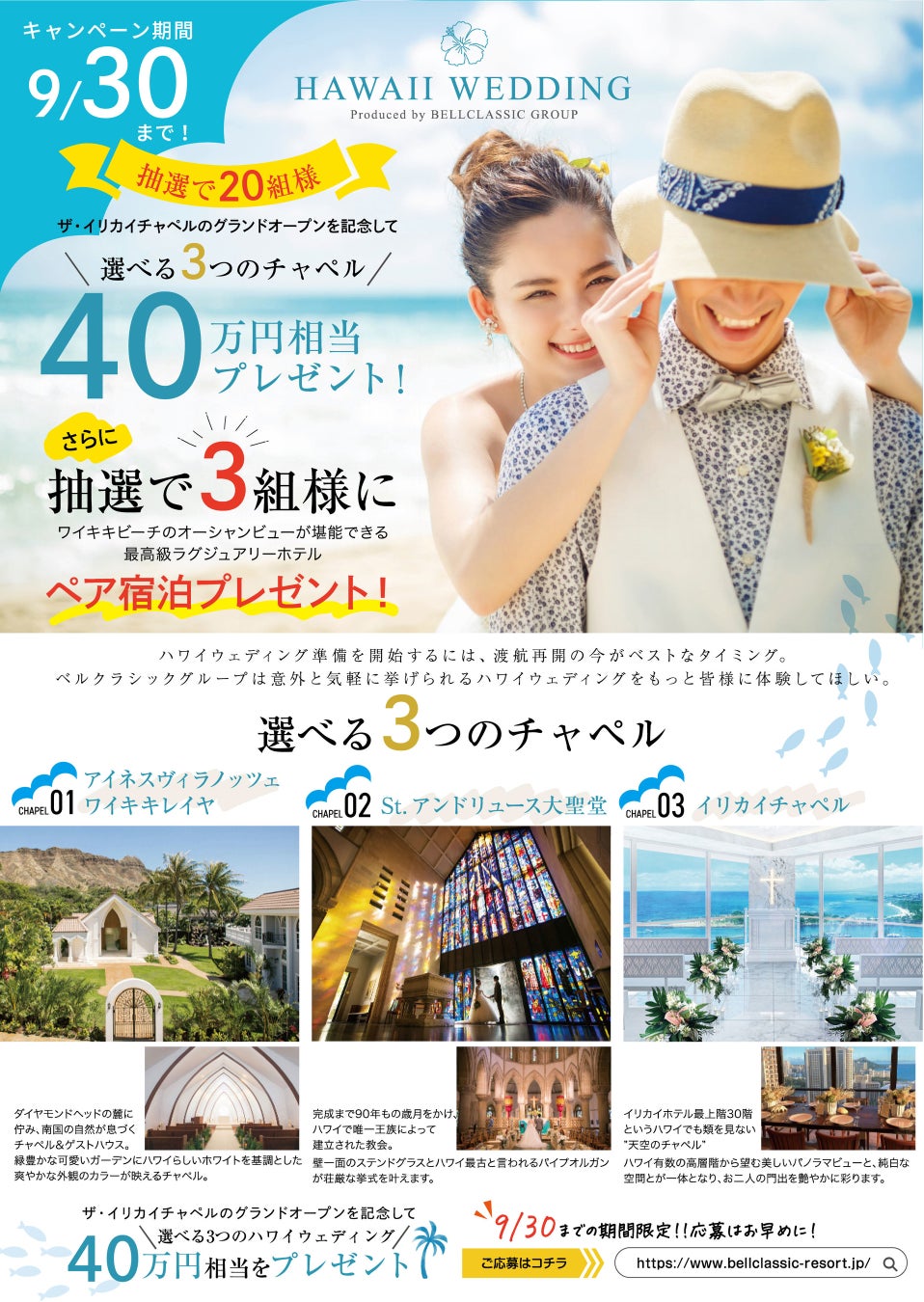 ハワイウェディング準備を開始するには、渡航再開の今がベストなタイミング。ベルクラシックグループは意外と気軽に挙げられるハワイウェディングをもっと皆様に体験してほしい。ザ・イリカイチャペルのグランドオープンを記念して選べる3つのハワイウェディング・40万円相当をプレゼント!