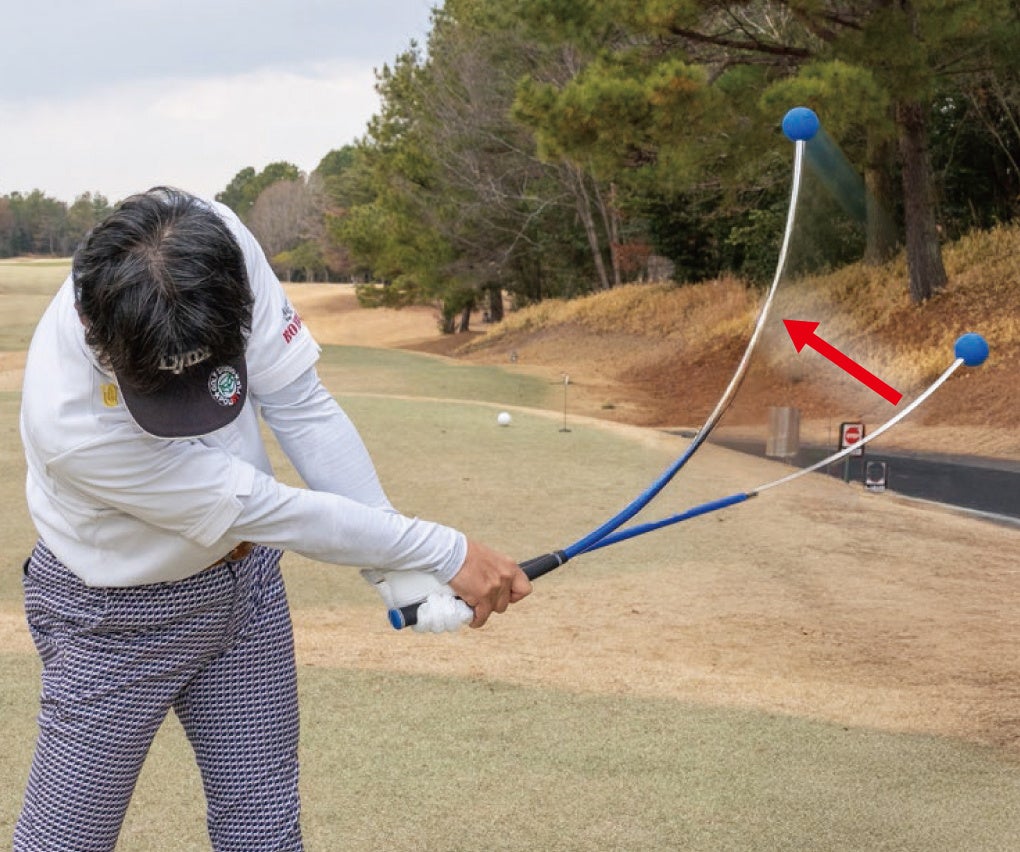 フォロースルーでは、 自分の方へボールを引き寄せることが重要です。 ボールを放り出すような動作をしてしまうと、スイング軌道が乱れ、 ヘッドの加速が十分に得られません。フレループNEOのしなりを活かし、 曲がる方向にボールを引き寄せることで、ヘッドスピードが向上し、 よりカ強く安定したスイングを身につけることができます。