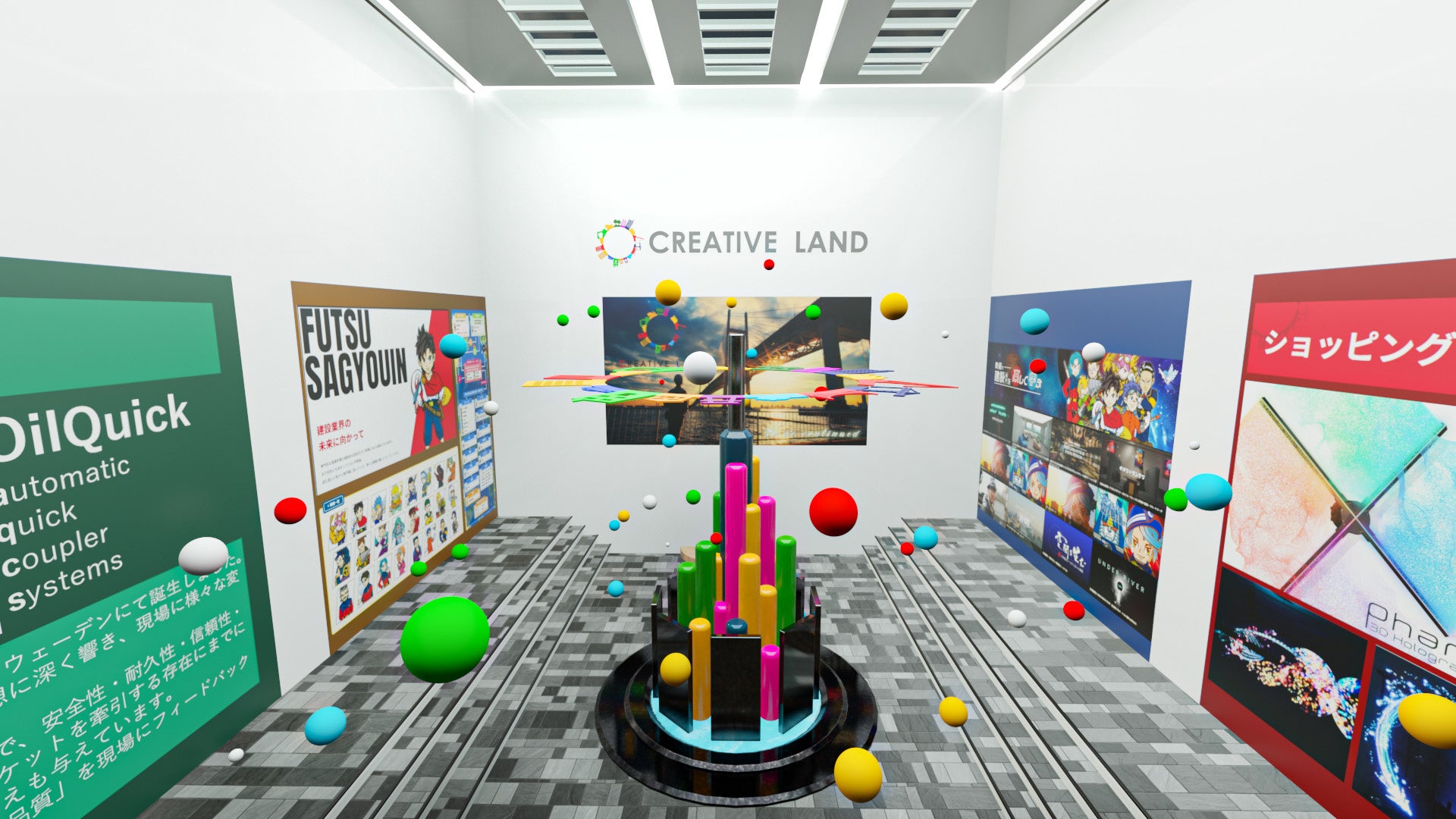 「CREATIVE LAND」のコンセプトを表現するオブジェクトをメタバース空間中央に配置しました。「CREATIVE LAND」のロゴを中央で回転させるなどメタバースならではの仕掛けを行いました。