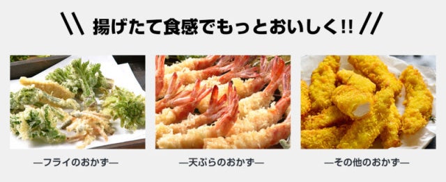 油を使わないため簡単に作れるだけでなく、掃除がしやすいので片付けの手間も減らせます。コロッケ・唐揚げなどの揚げ物惣菜の温め直しにも最適です。揚げたてのようにサックサク食感になりますよ!
