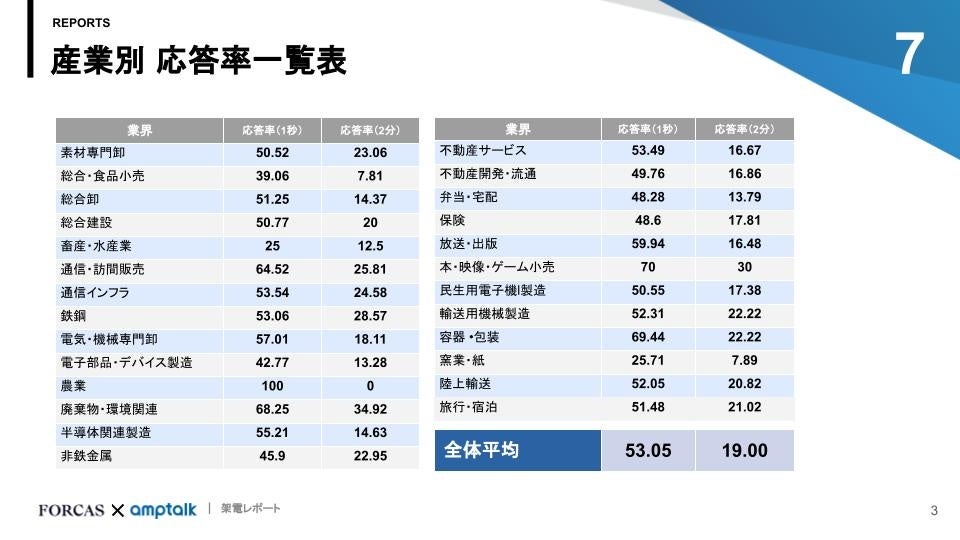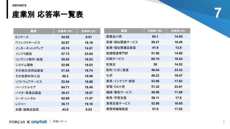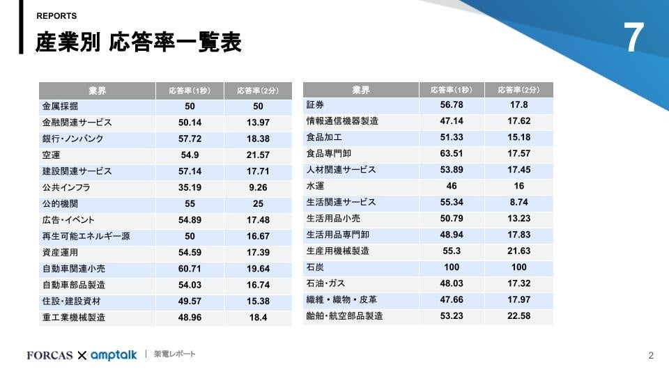 つまり、どんな業界でも2回に1回は何かしらの応答をしてもらえることが期待でき、更にそこから会話を続け2分以上会話を続けられているケースは5回に1回程度でした。