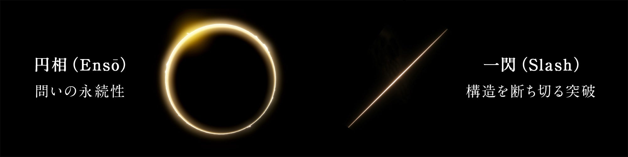 新しいロゴは「円相(Ensō)」と「一閃(Slash)」を融合したデザインです。円相は“問いを続ける未完性”を、一閃は“構造を切り開く突破力”を象徴します。配色は伝統三色の蒔絵金・漆黒・真朱、比率は白銀比(大和比)を採用し、簡素・調和・余白の美学で思想と文化を結ぶ構造的デザインを体現しています。