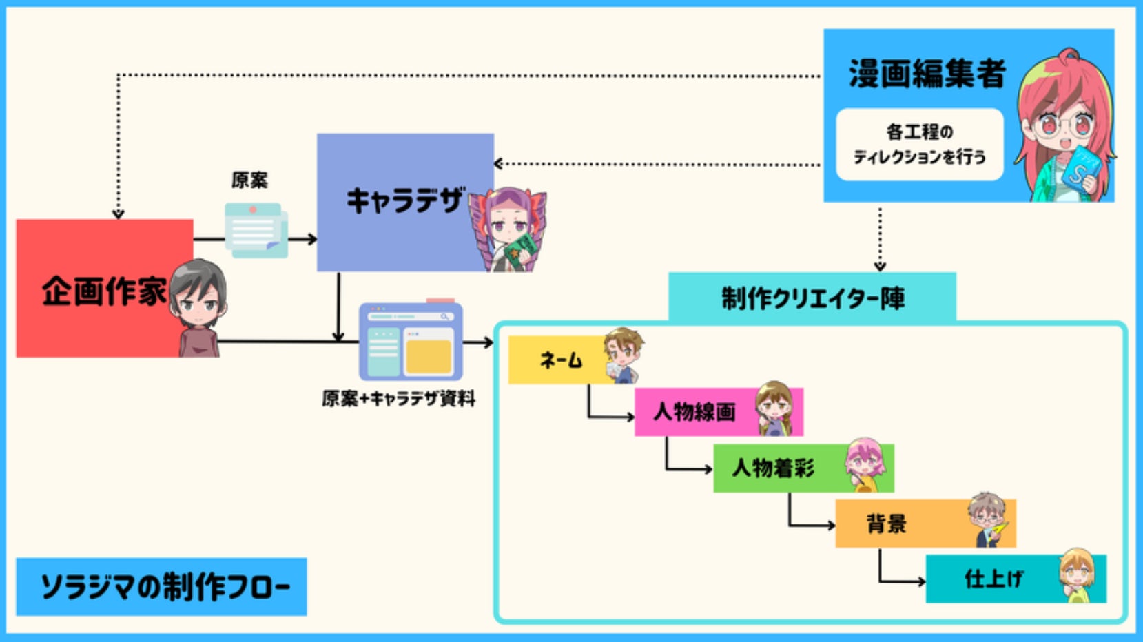 編集者が原作者と連携を取ることは同じですが、ネーム・イラスト・カラー・背景などそれぞれの工程ごとに専門の担当者を編集者が採用して制作を行います。