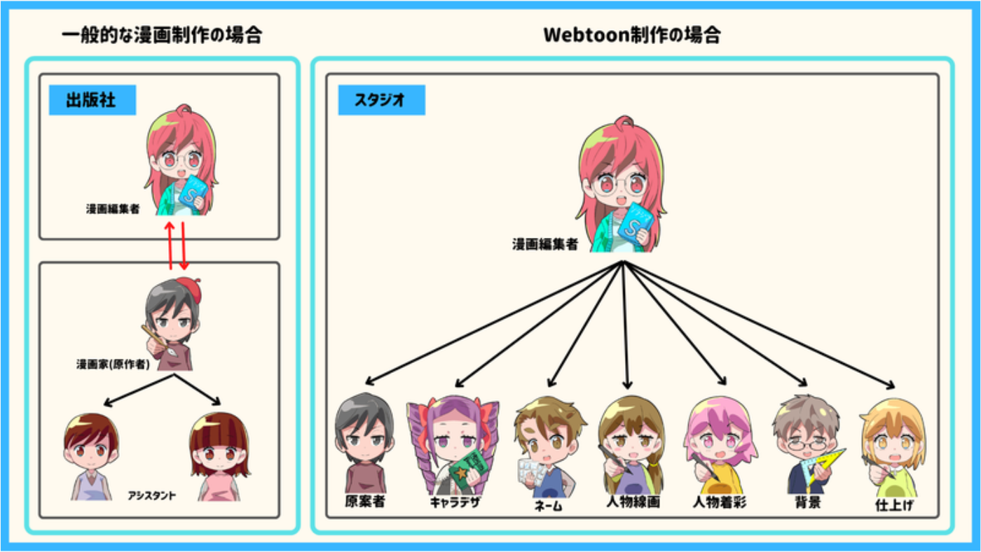 Webtoonの制作は、従来の漫画とは異なる「スタジオ型」です。