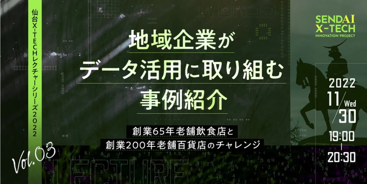 オンライン講演 仙台X-TECHレクチャーシリーズVol.3 『地域企業がデータ活用に取り組む事例紹介~創業65年老舗飲食店と創業200年老舗百貨店のチャレンジ~』開催