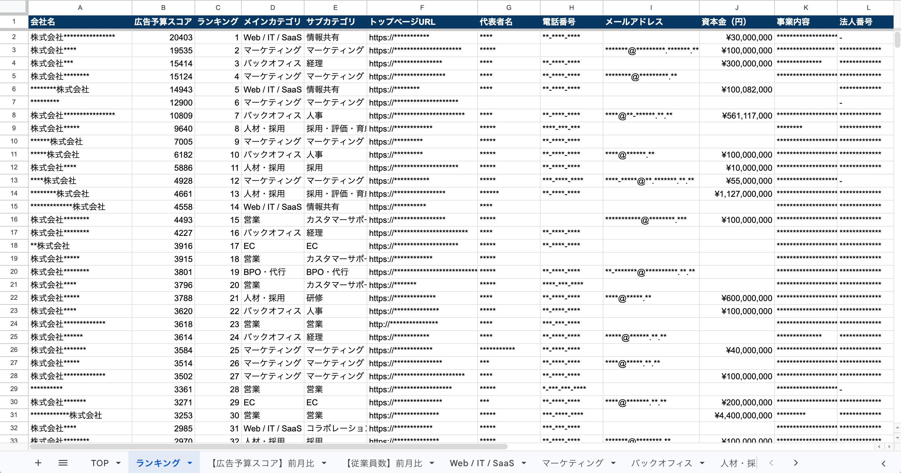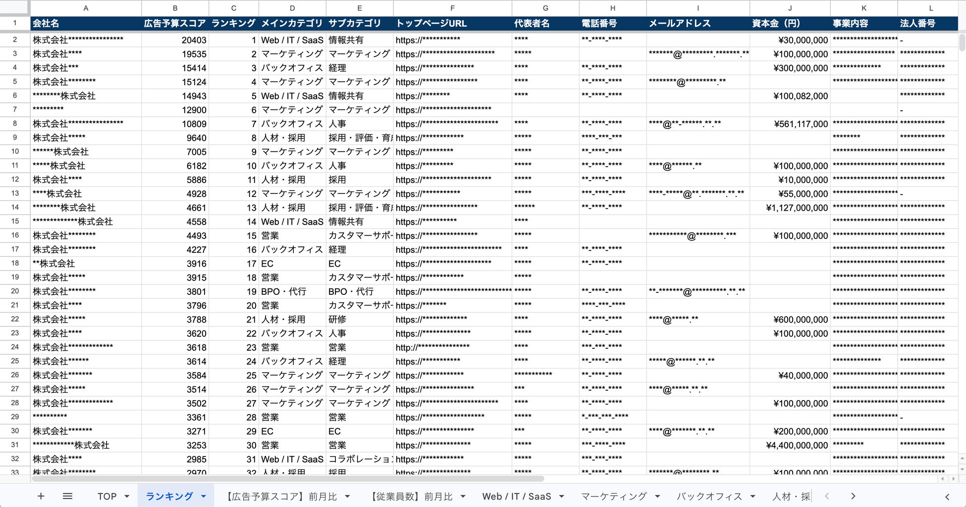 上記の情報を収録しており、フォーム営業やテレアポなどの営業施策にそのままご活用いただけます。