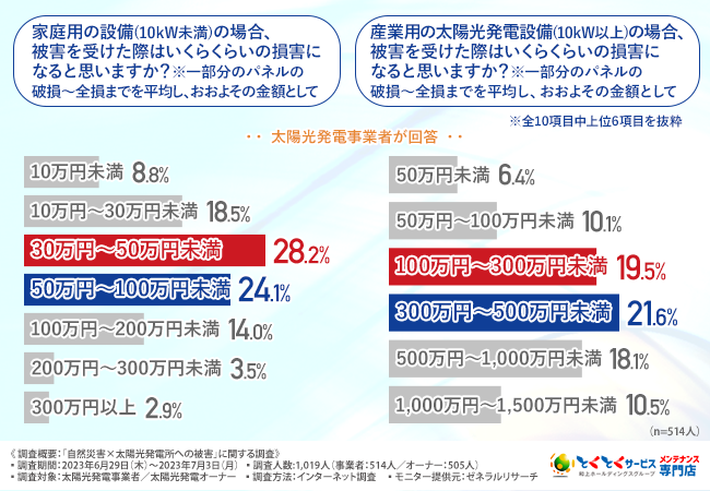 ・【太陽光発電事業者】被害額では、家庭用の場合は30万円~100万円、産業用は100万円~500万円が多い