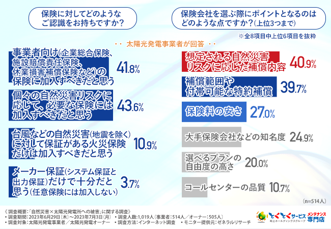 「保険に対してどのようなご認識をお持ちですか?」と質問したところ、『事業者向け(企業総合保険、施設賠償責任保険、休業損害補償保険など)の保険に加入すべきだと思う(41.8%)』『個々の自然災害リスクに応じて、必要な保険には加入すべきだと思う(43.6%)』『台風などの自然災害(地震を除く)に対して保証がある火災保険だけは加入すべきだと思う(10.9%)』『メーカー保証(システム保証と出力保証)だけで十分だと思う(任意保険には加入しない)(3.7%)』という回答結果になりました。