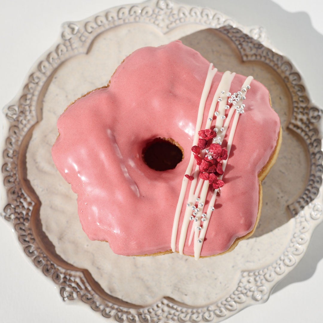 桜の形をしたブリオッシュ生地のふわもち食感のドーナツに、いちごの程よい酸味が楽しめる風味豊かないちごチョコレートをコーティングしました。ホワイトチョコレートのデコレーションの上にはフリーズドライのフランボワーズとキラキラ光るアラザンがトッピングされています。
