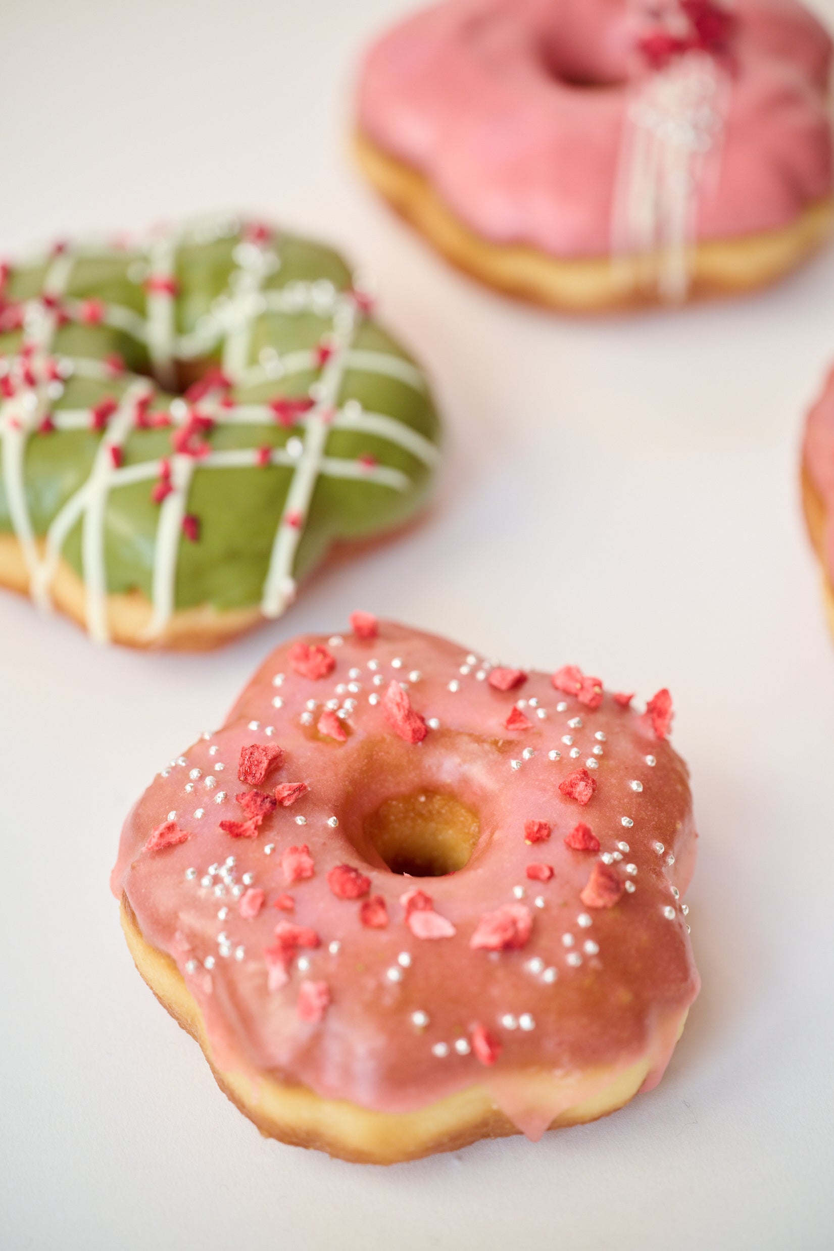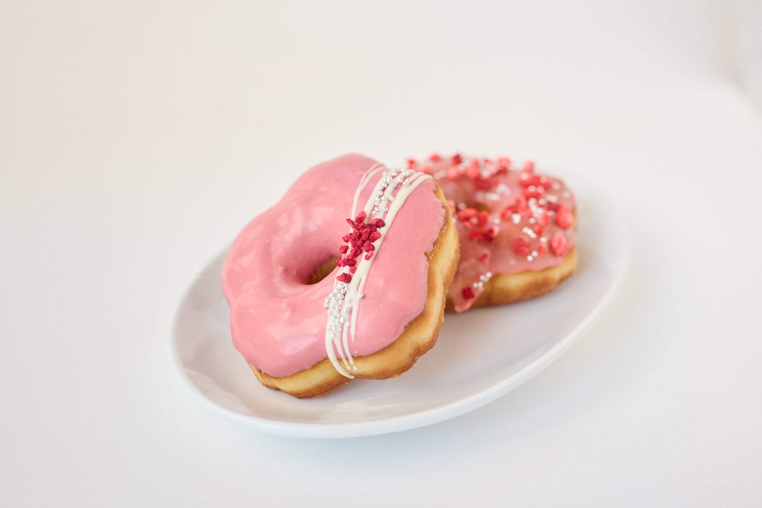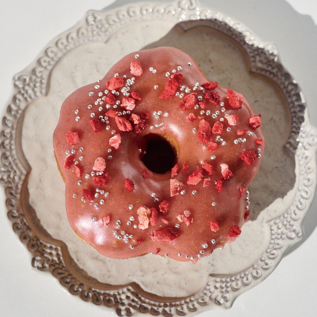 規格外のフレッシュないちごをメインに丸ごとピュレにし、グレーズとして使用しています。爽やかないちごの風味が楽しめるドーナツには、フリーズドライのいちごとアラザンがトッピングされ、華やかに仕上げられています。