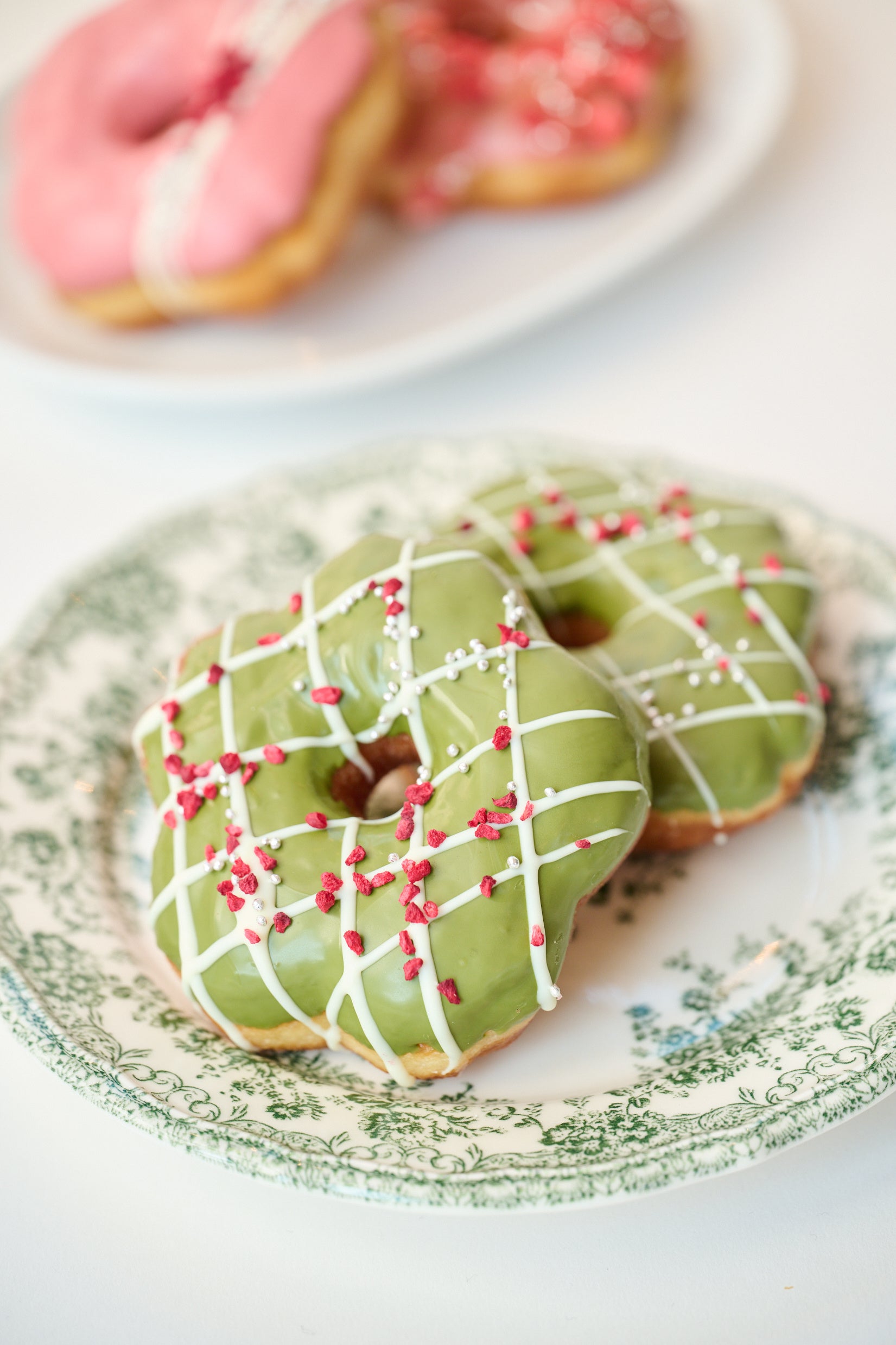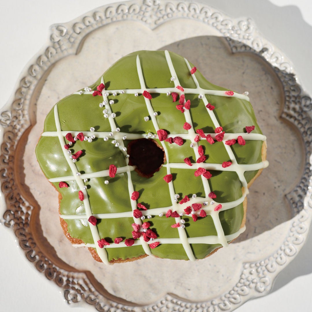 桜の形をしたブリオッシュ生地のドーナツには、抹茶の風味とすっきりとした口溶けが特徴の抹茶チョコレートを合わせられています。ホワイトチョコレートでデコレーションされ、ドライフランボワーズとアラザンがトッピングされた可愛いドーナツです。